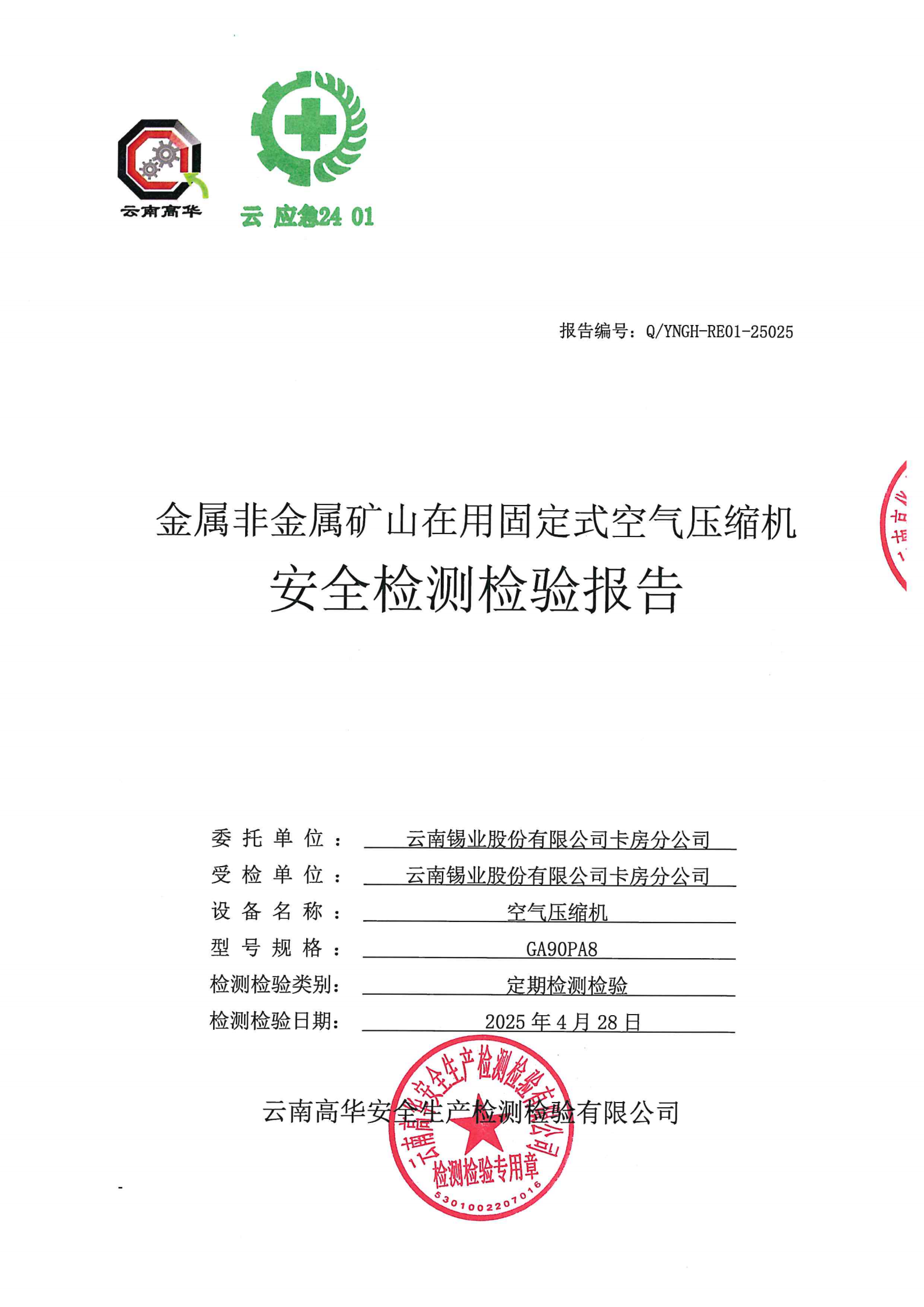 金属非金属矿山在用固定式空气压缩机安全检测检验报告