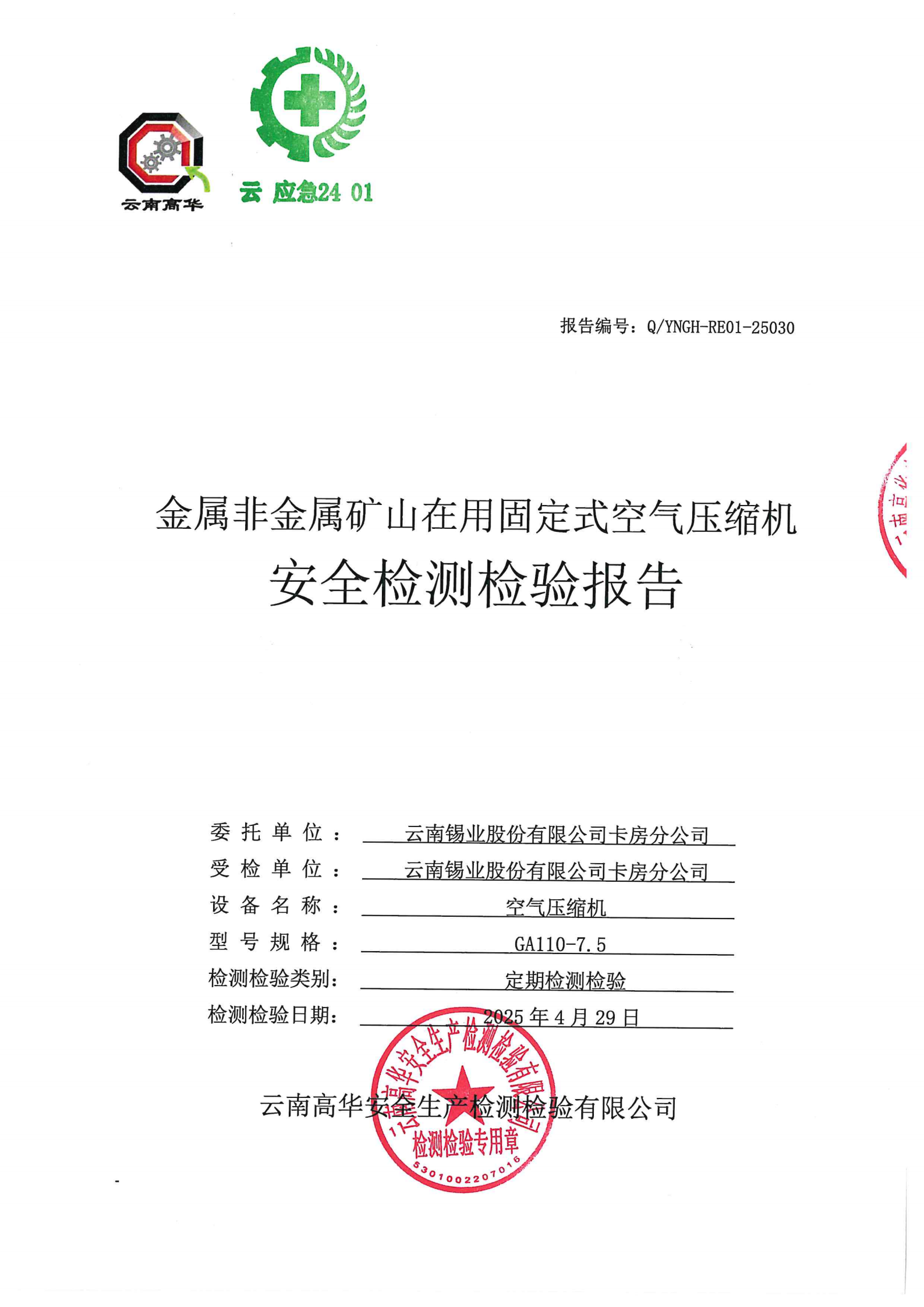 金属非金属矿山在用固定式空气压缩机安全检测检验报告