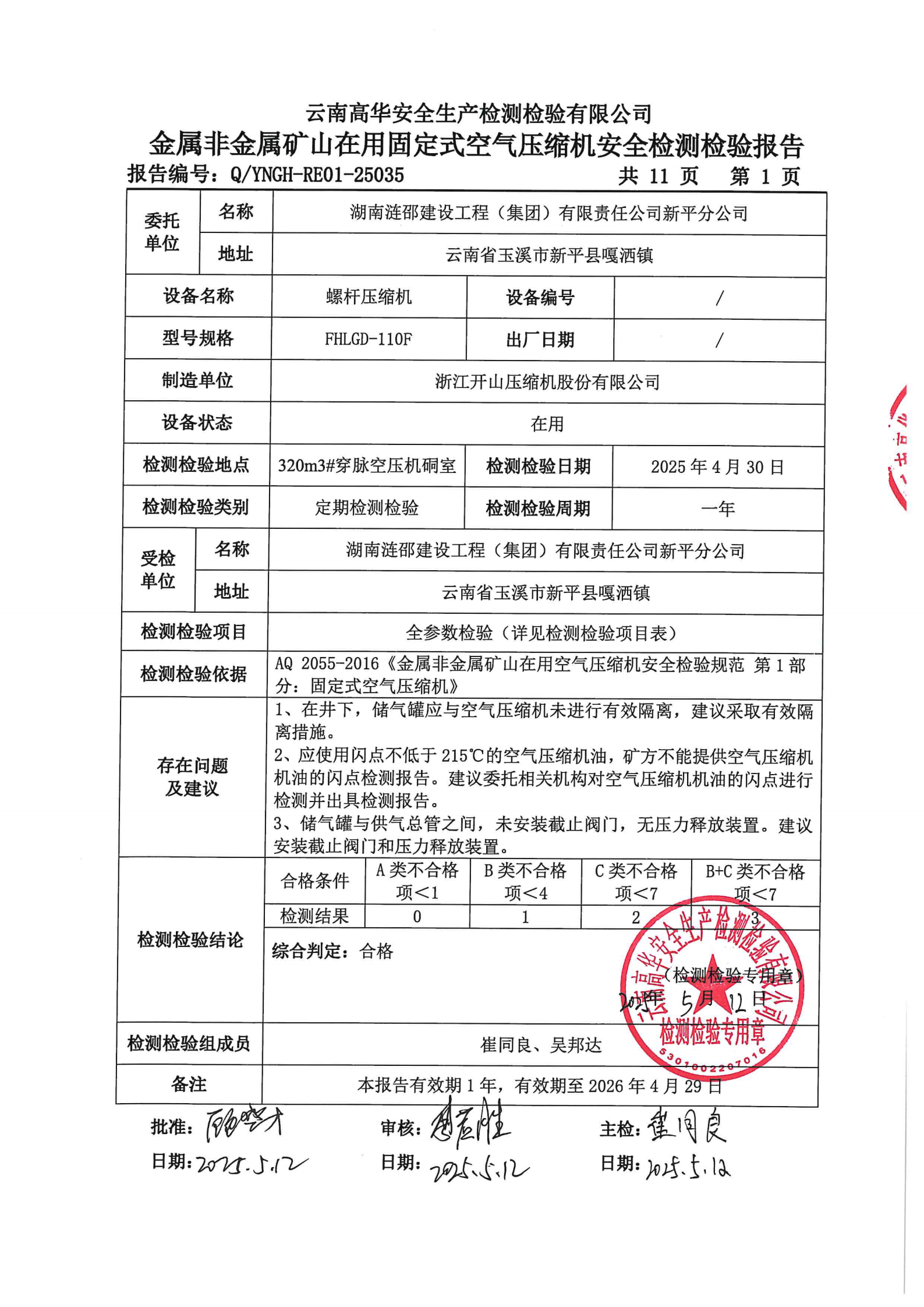 金属非金属矿山在用固定式空气压缩机安全检测检验报告