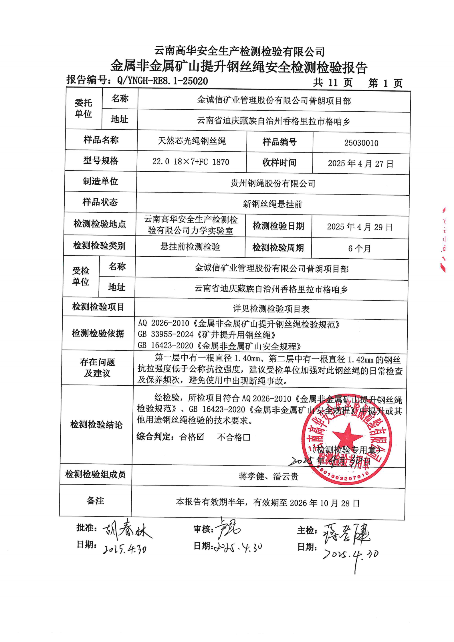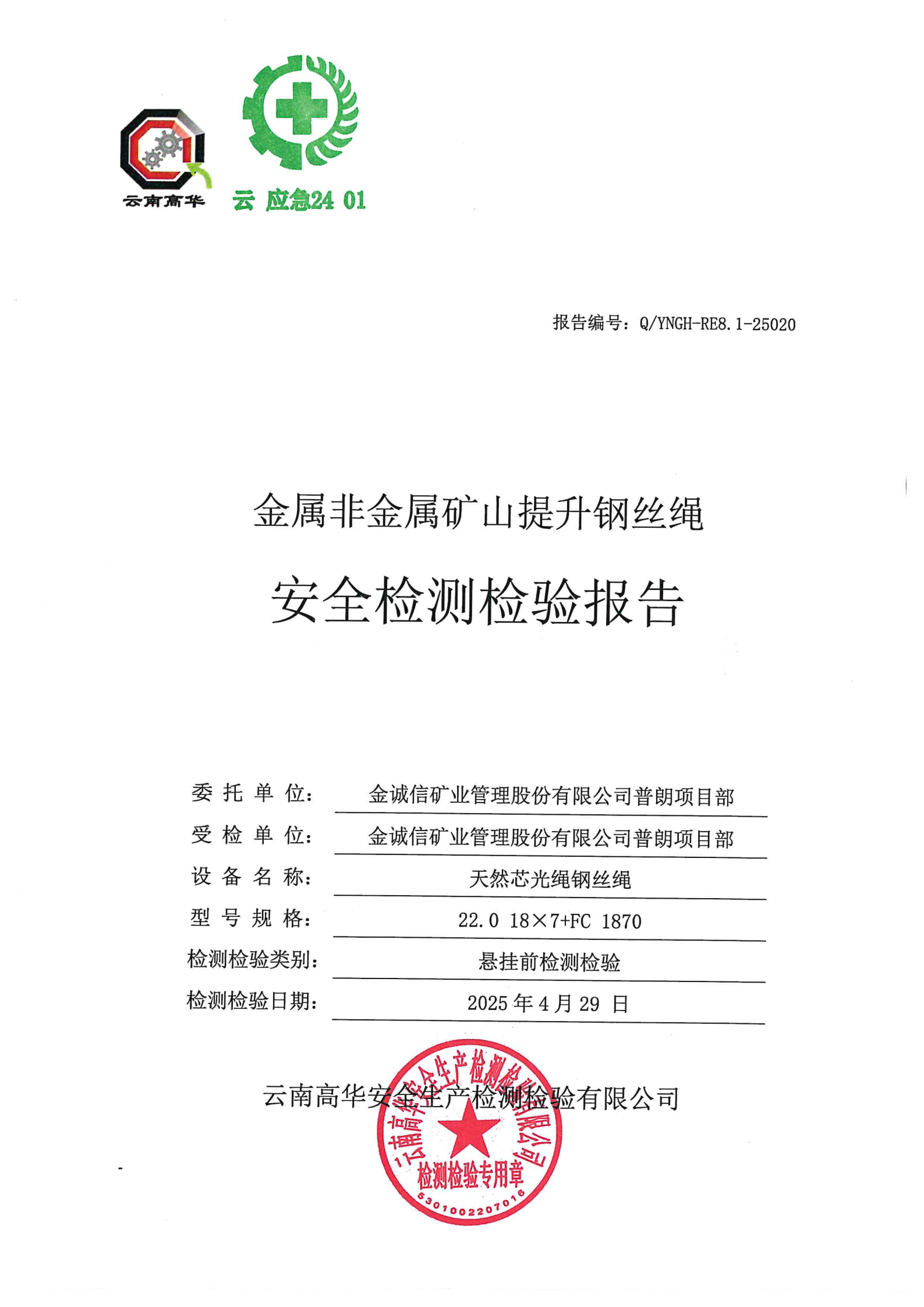 金属非金属矿山提升钢丝绳安全检测检验报告