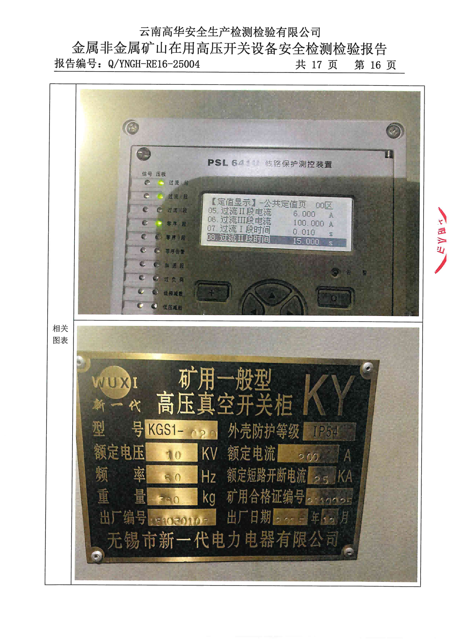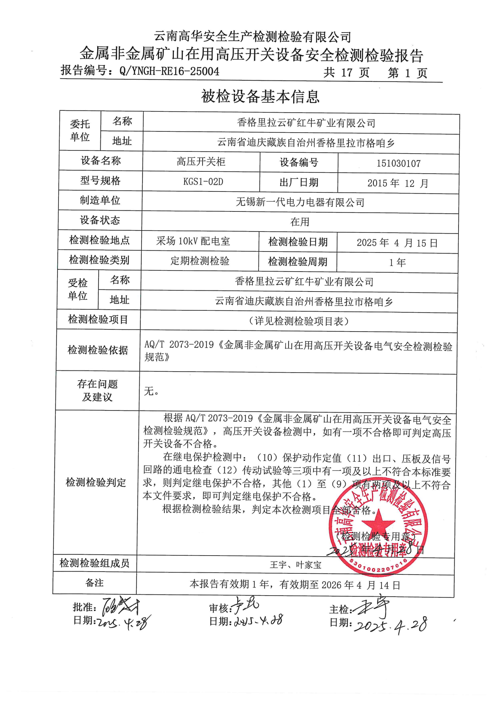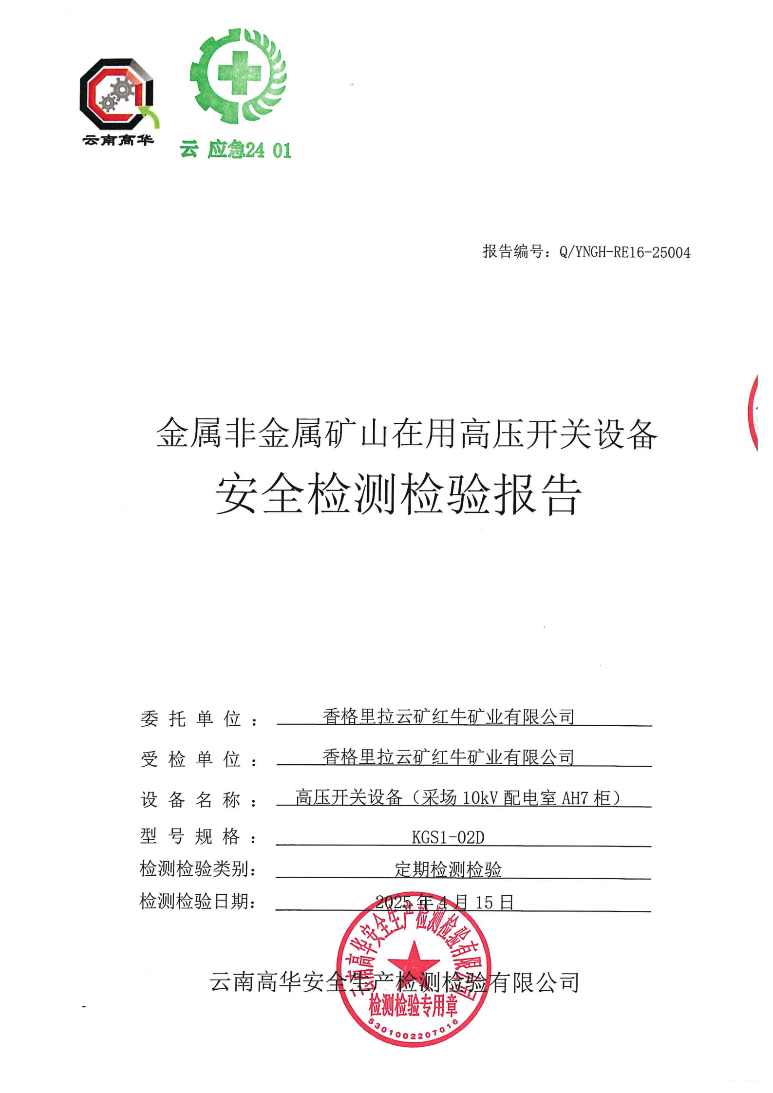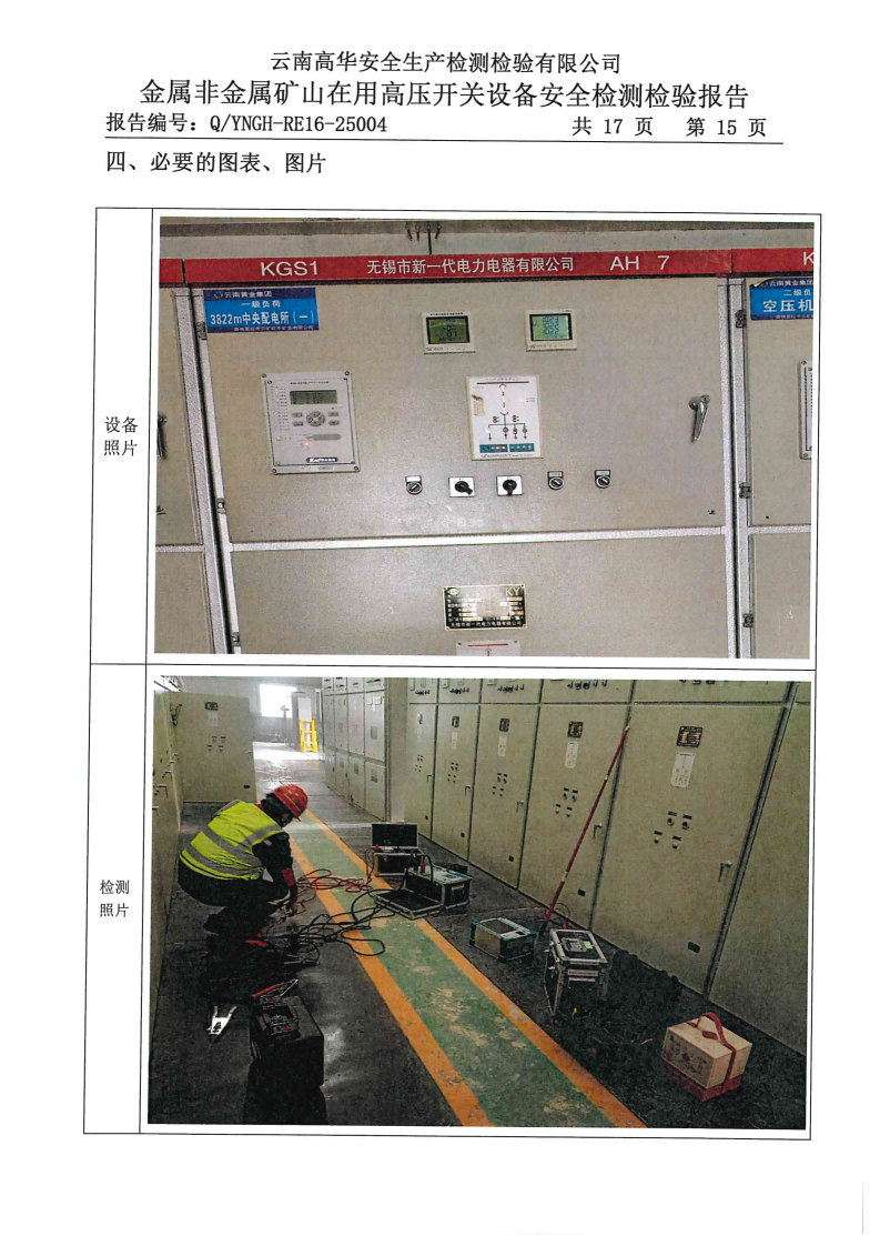 金属非金属矿山在用高压开关设备安全检测检验报告