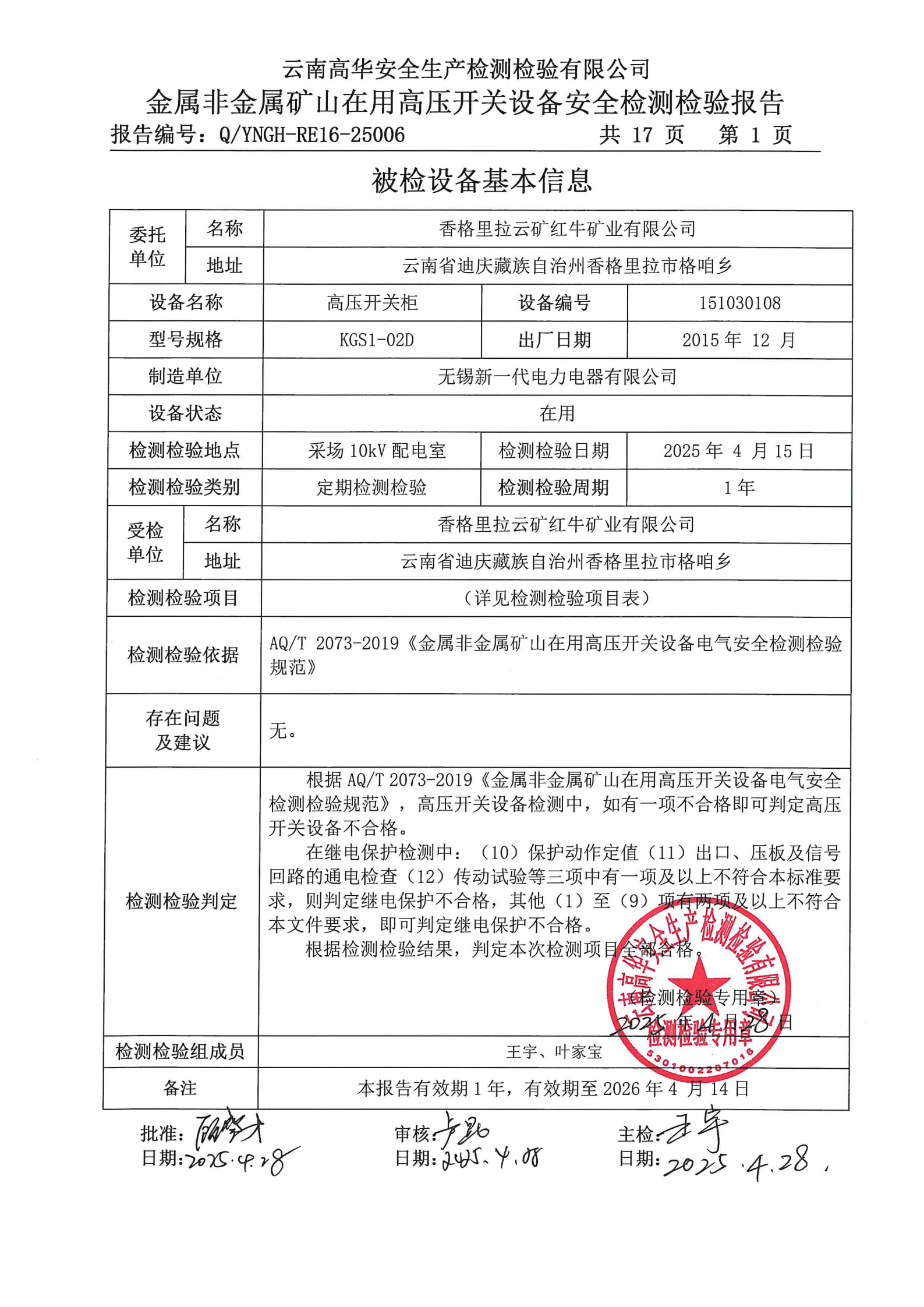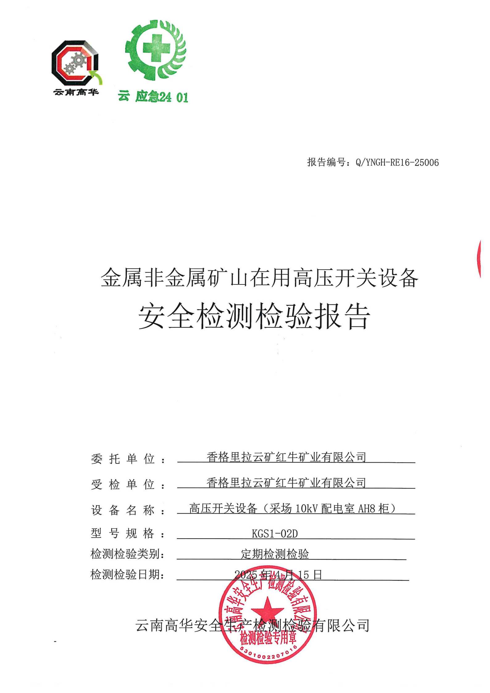 金属非金属矿山在用高压开关设备安全检测检验报告