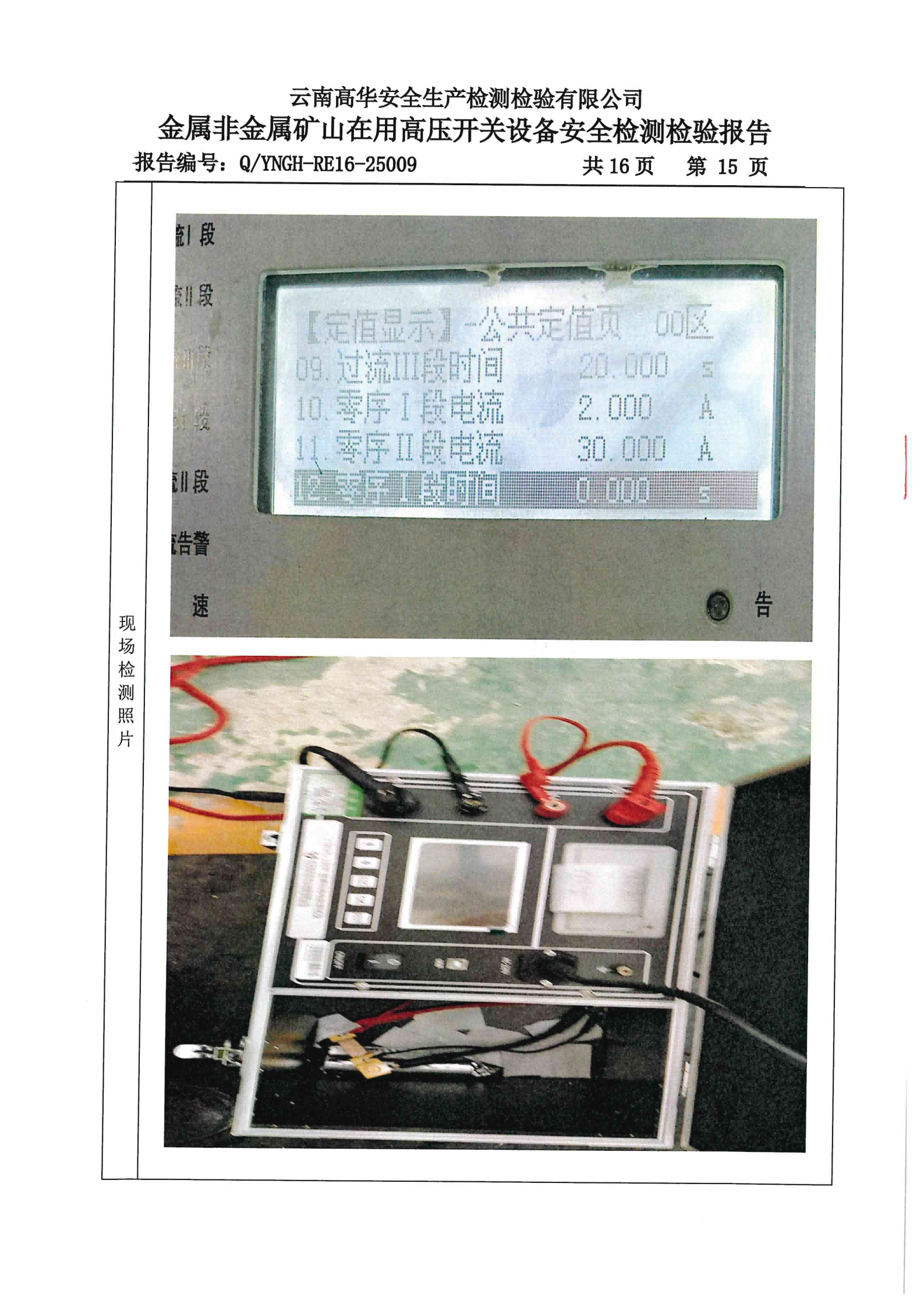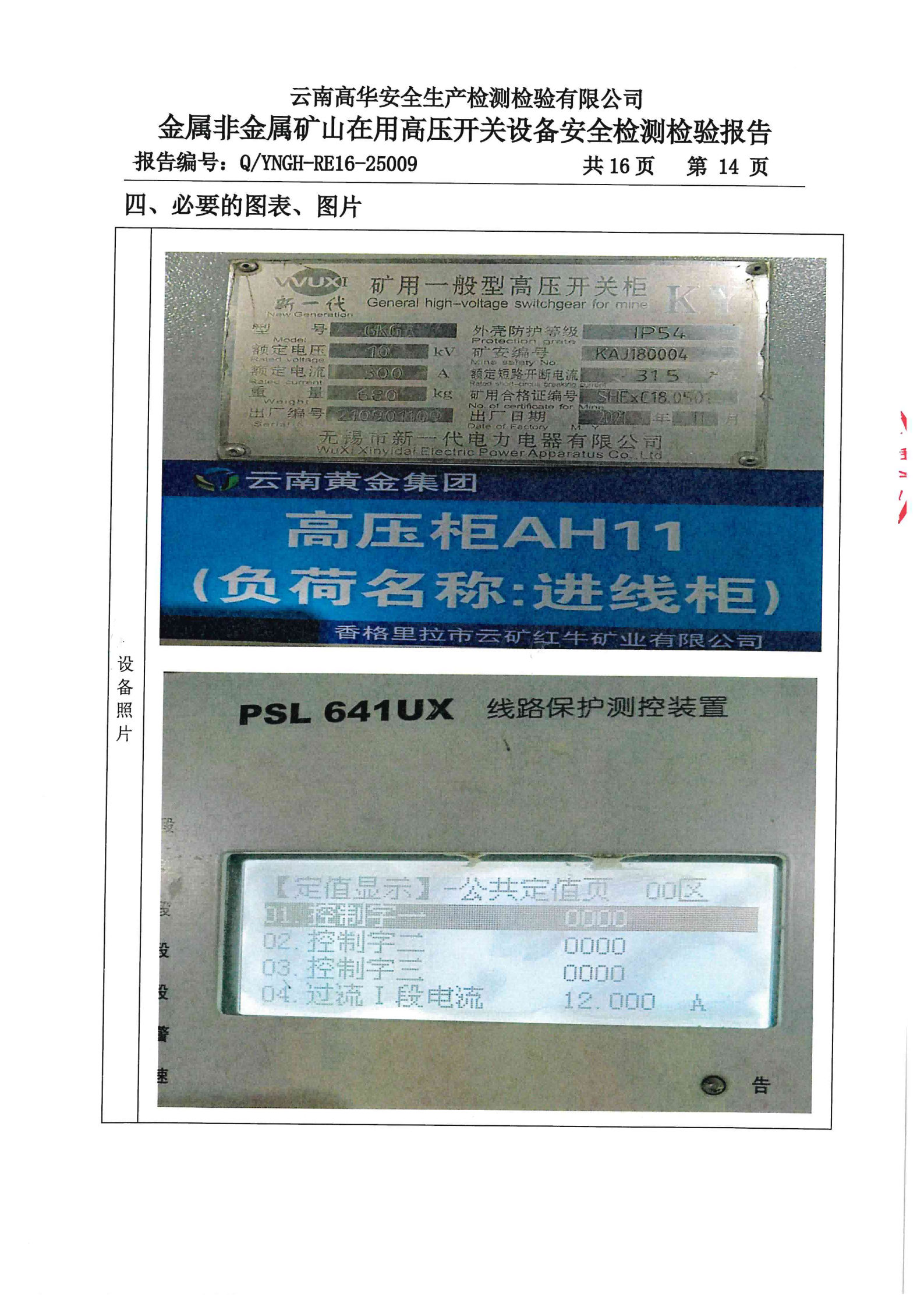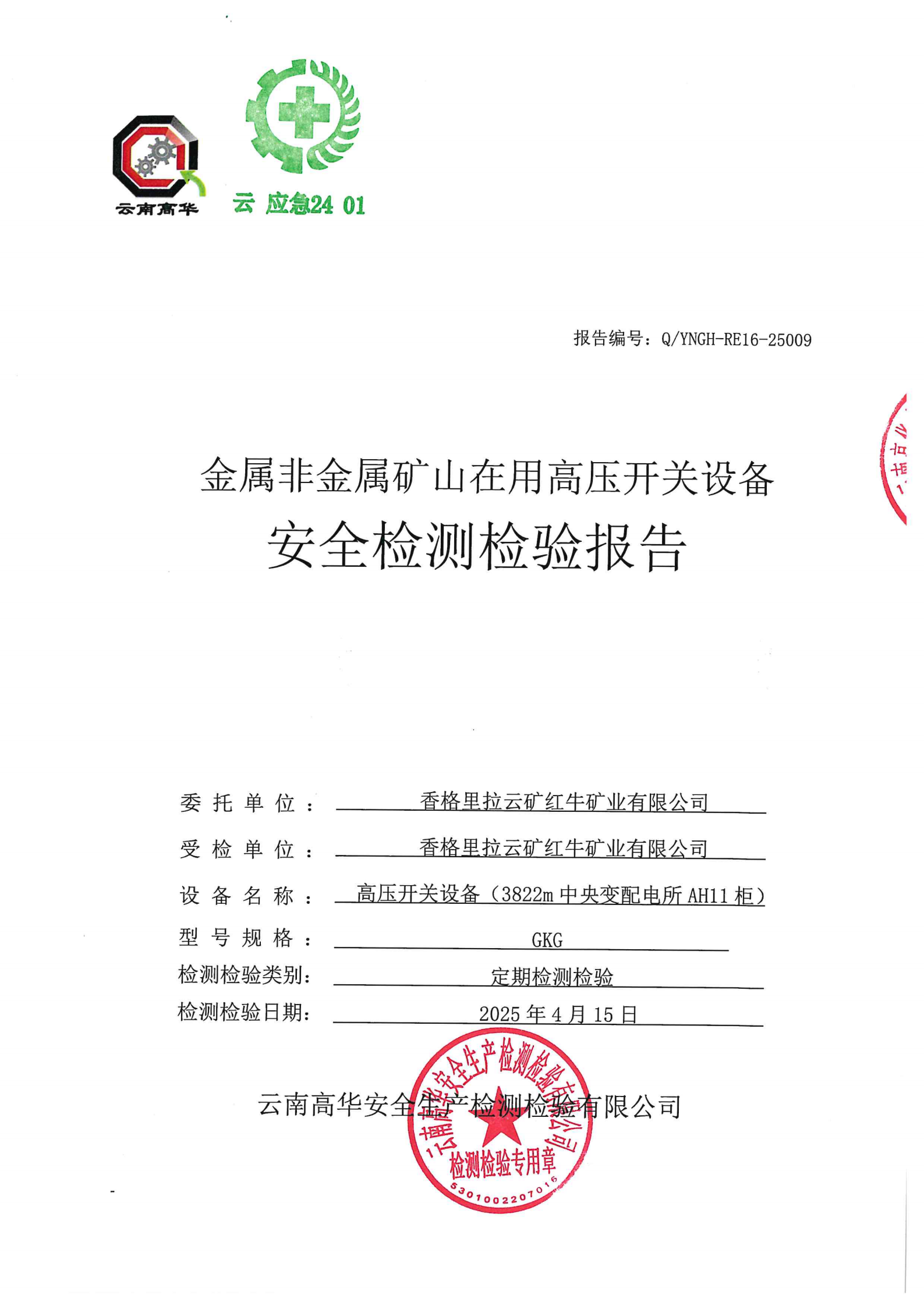 金属非金属矿山在用高压开关设备安全检测检验报告