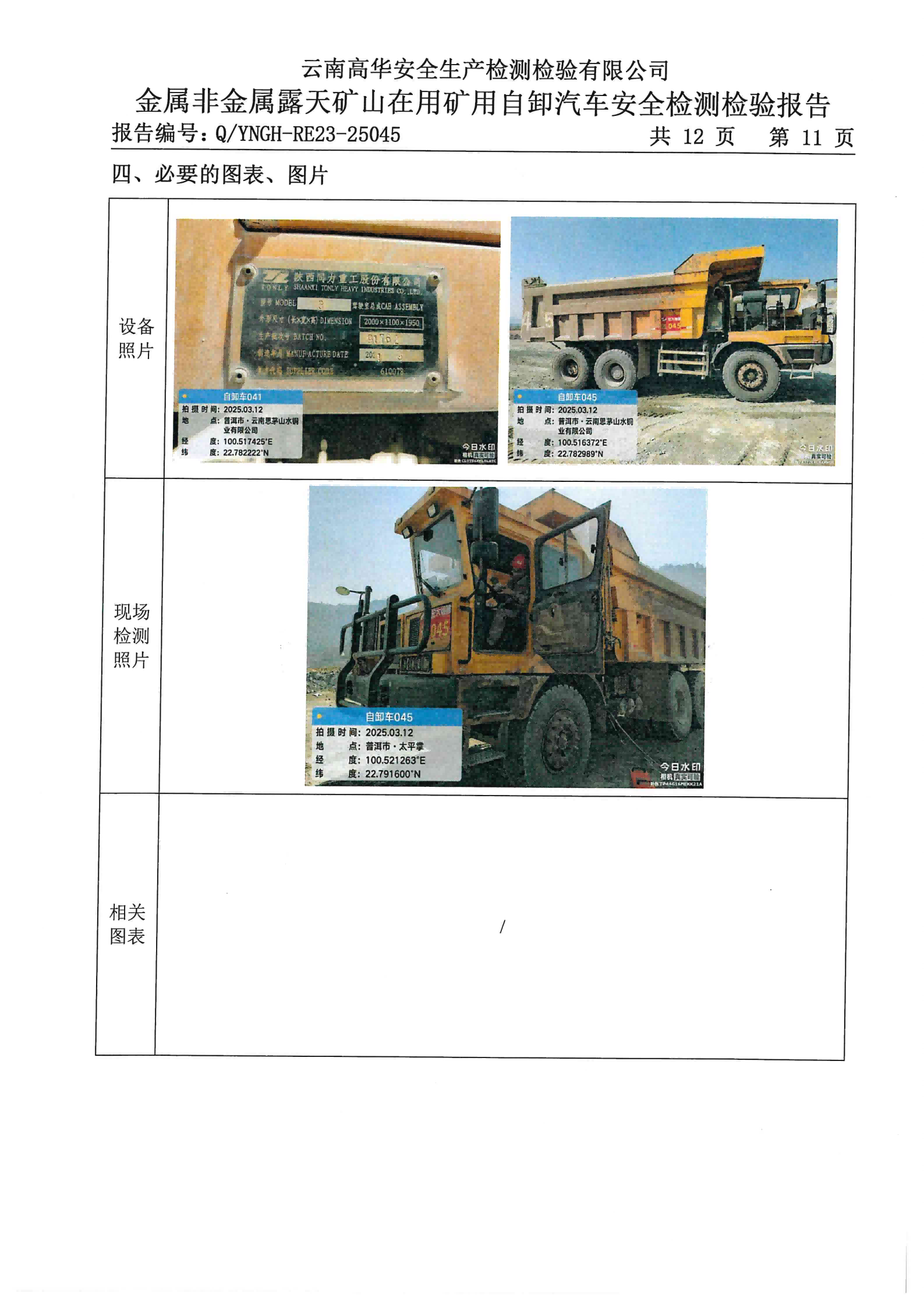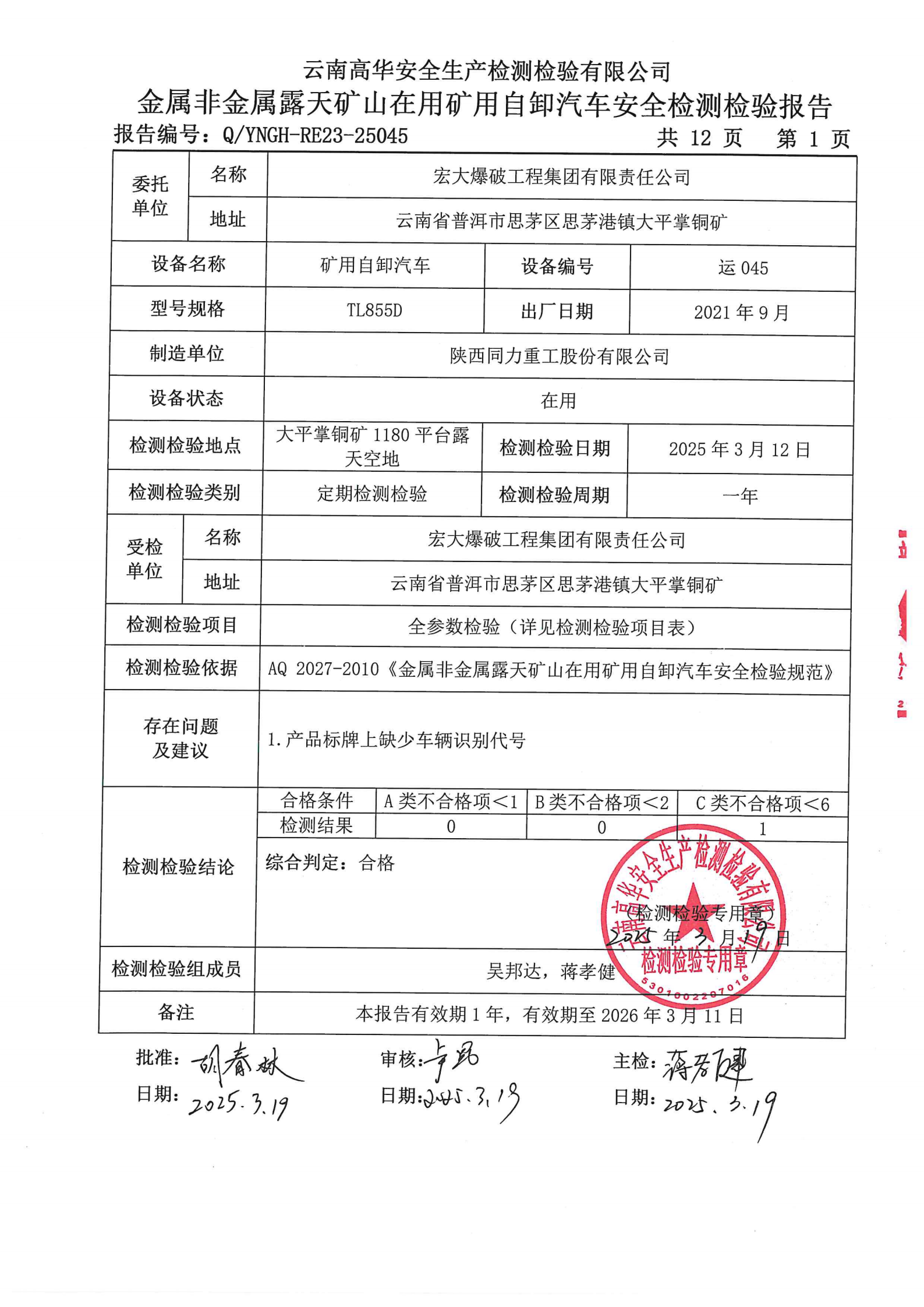 金属非金属露天矿山在用矿用自卸汽车安全检测检验报告