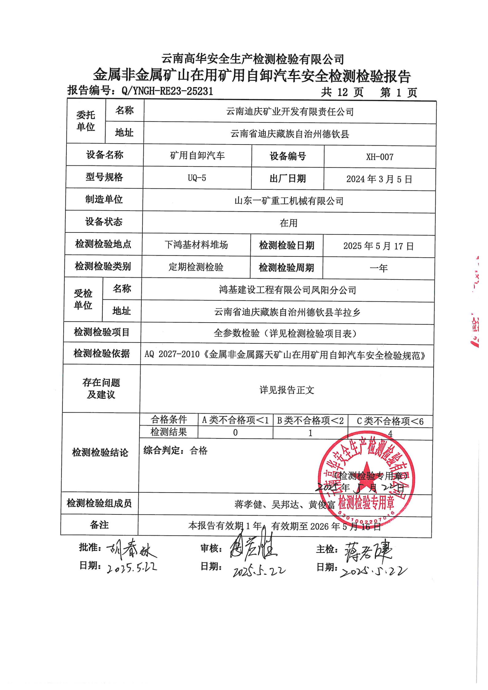 金属非金属矿山在用矿用自卸汽车安全检测检验报告