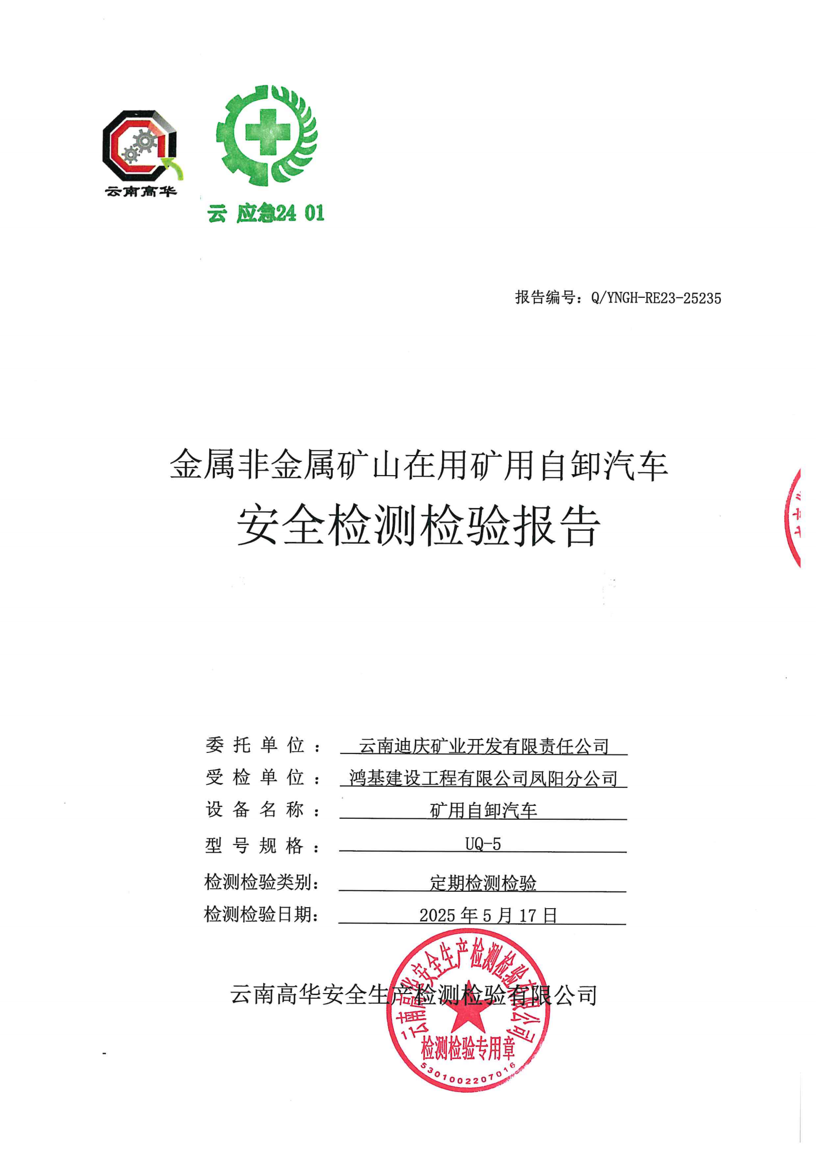 金属非金属矿山在用矿用自卸汽车安全检测检验报告
