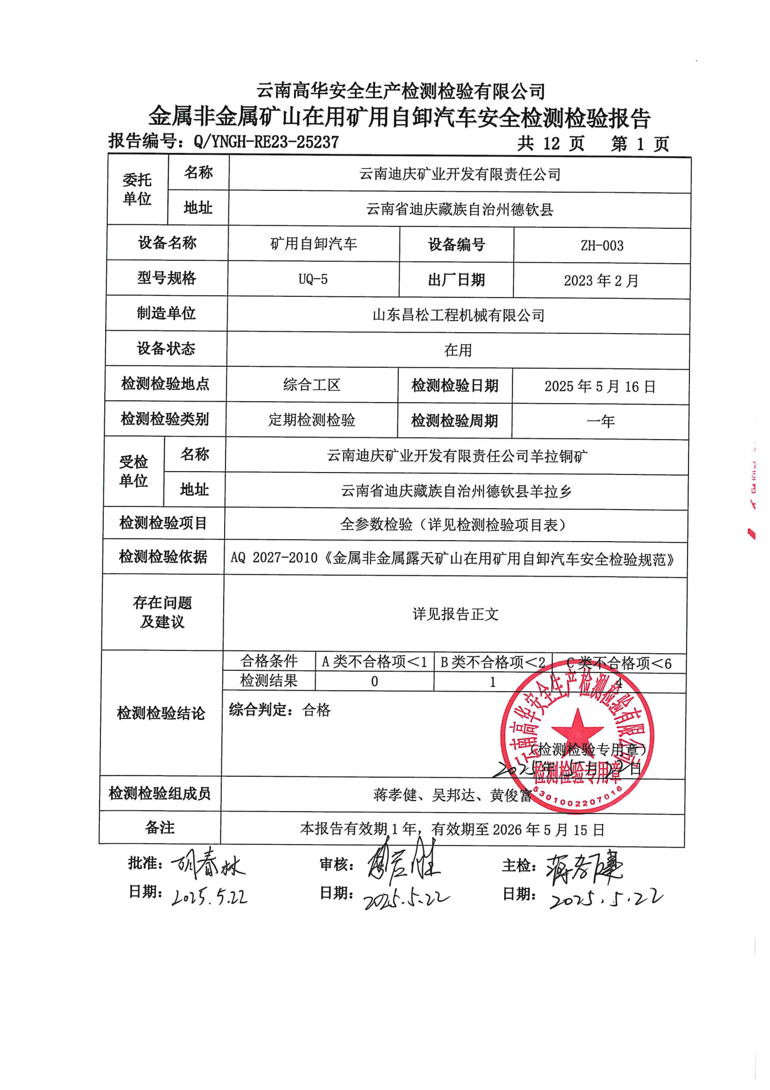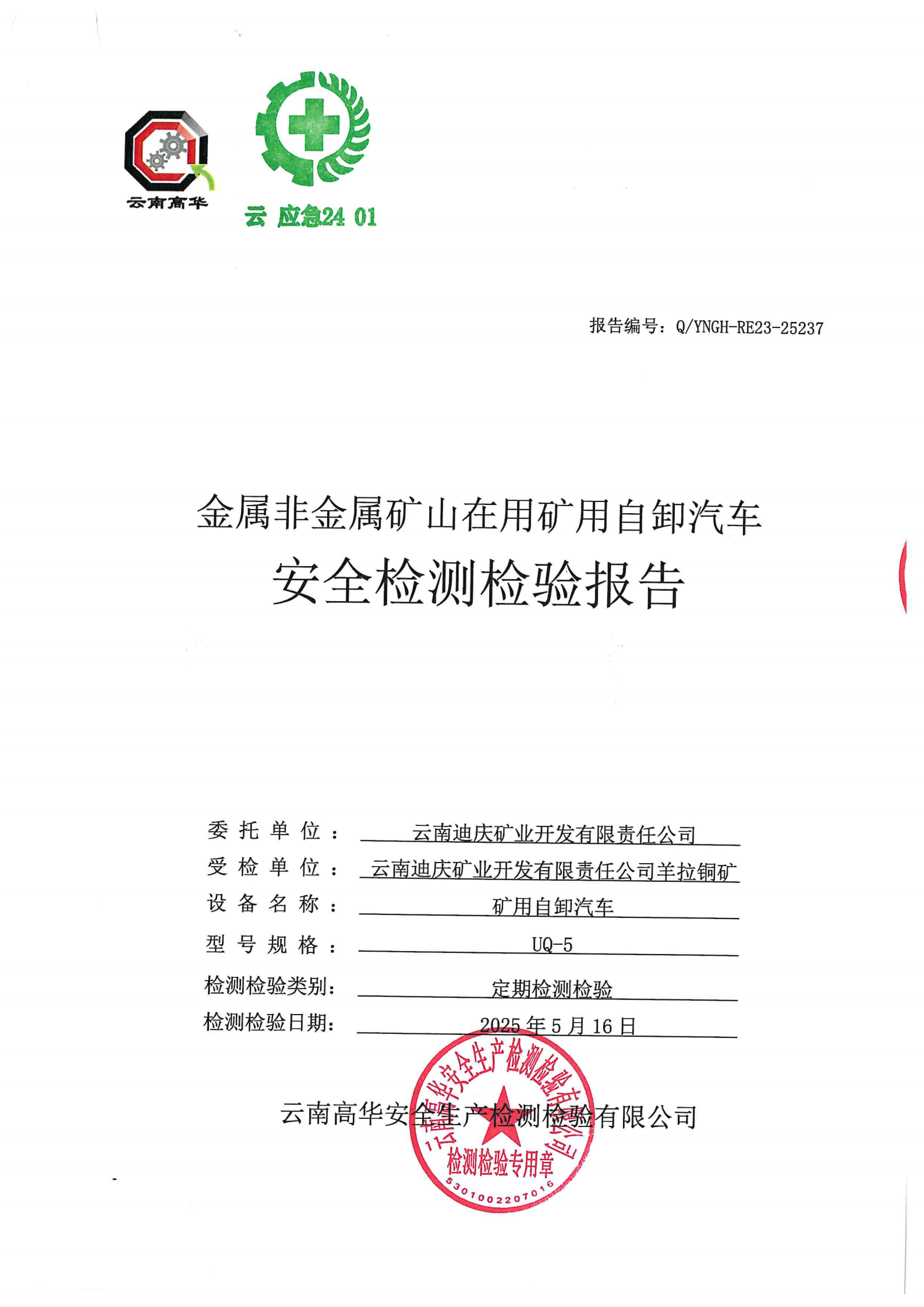 金属非金属矿山在用矿用自卸汽车安全检测检验报告