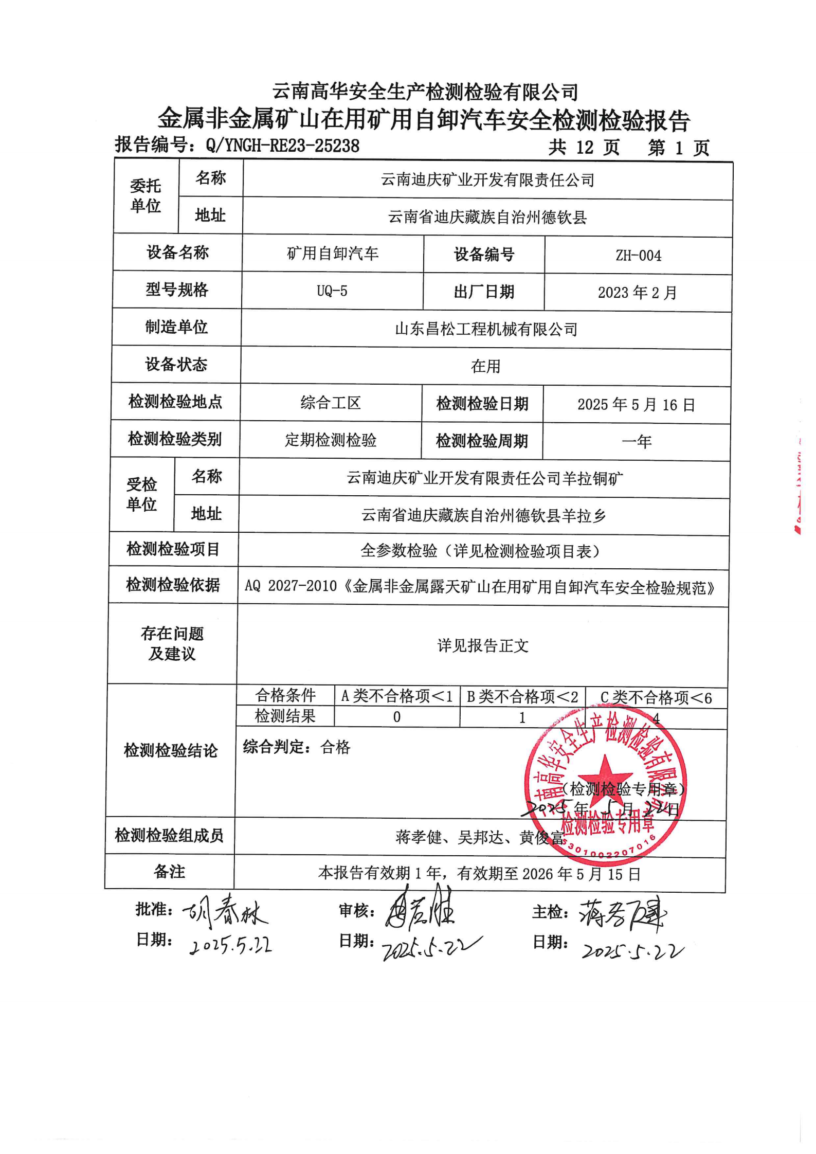 金属非金属矿山在用矿用自卸汽车安全检测检验报告