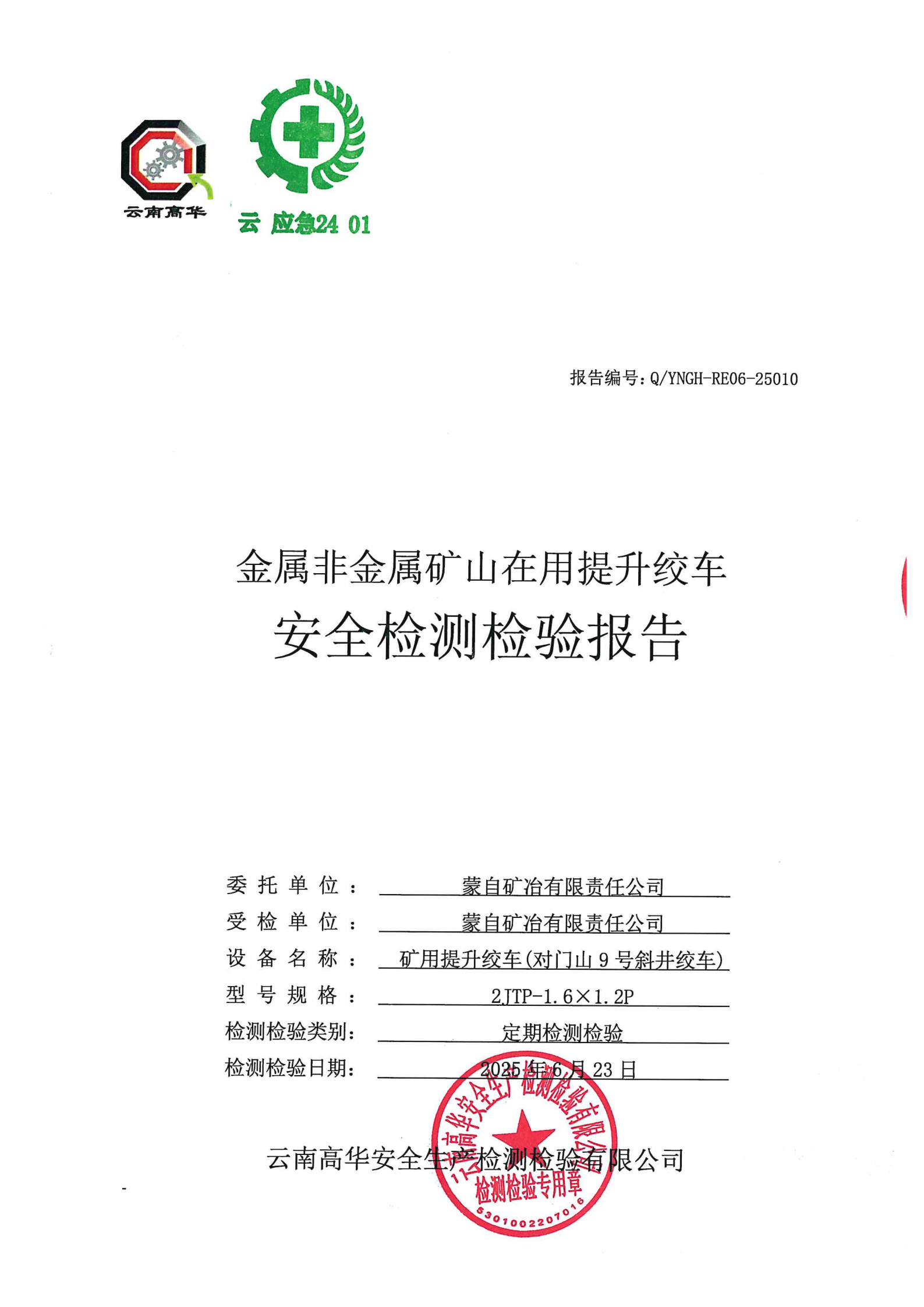 金属非金属矿山在用提升绞车安全检测检验报告