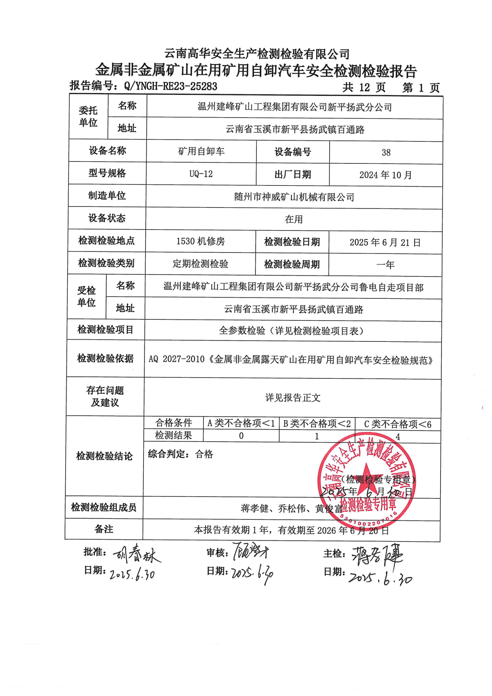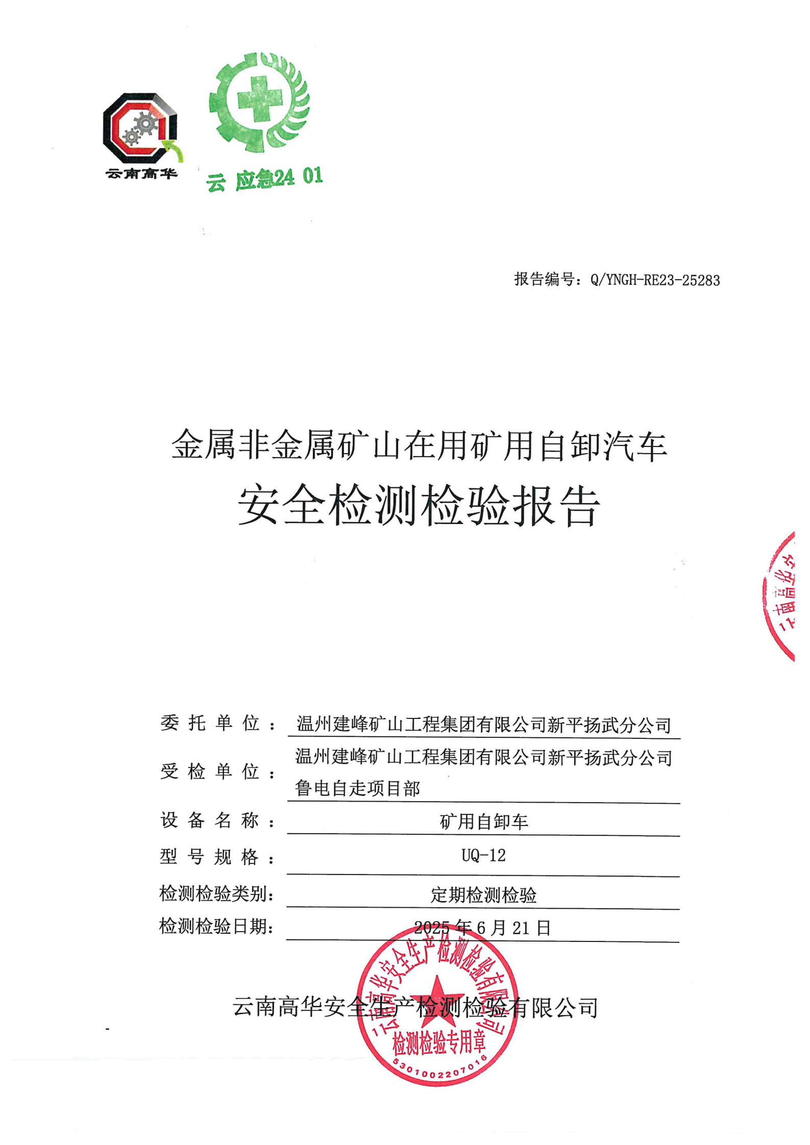 金属非金属矿山在用矿用自卸汽车安全检测检验报告