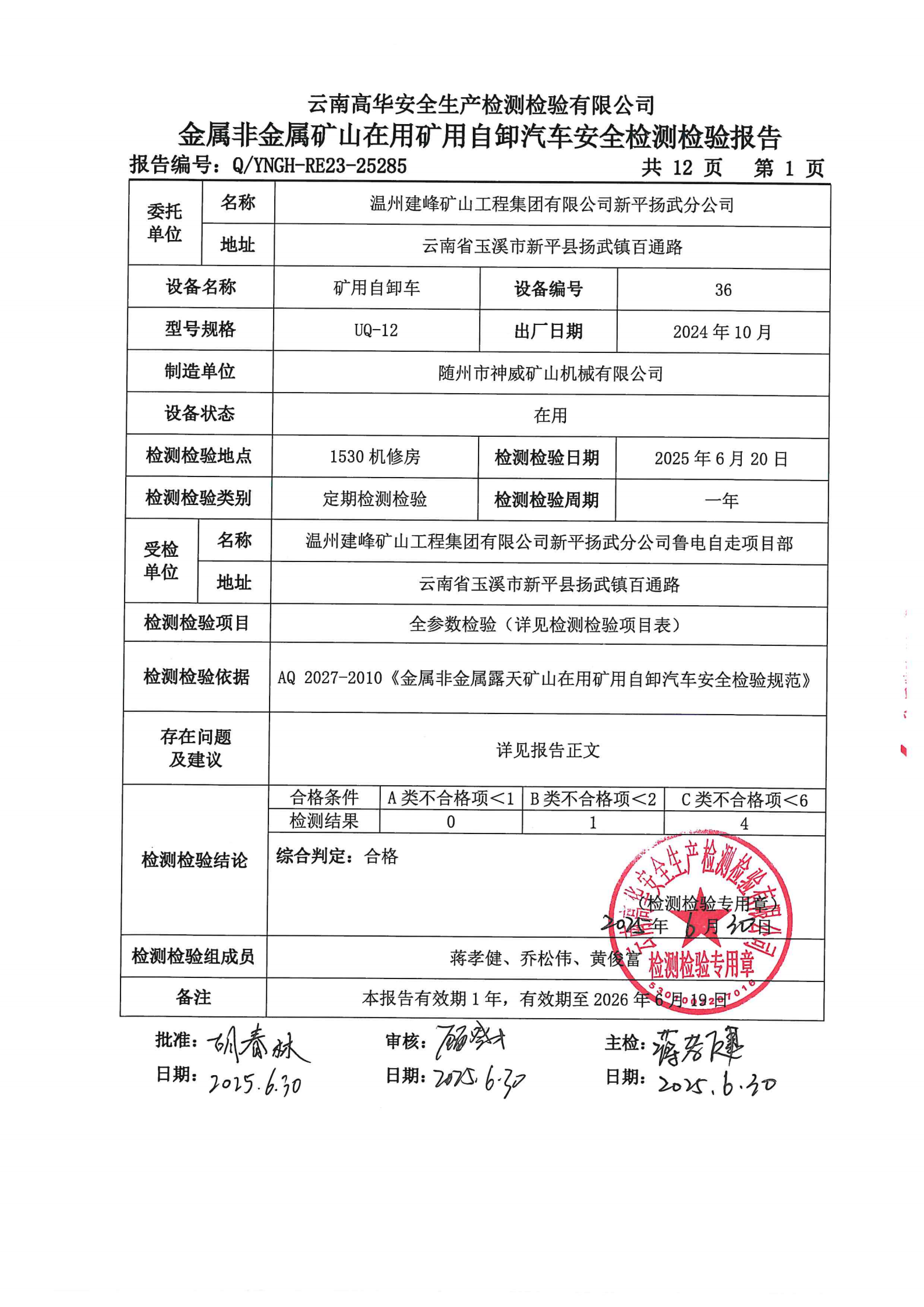 金属非金属矿山在用矿用自卸汽车安全检测检验报告