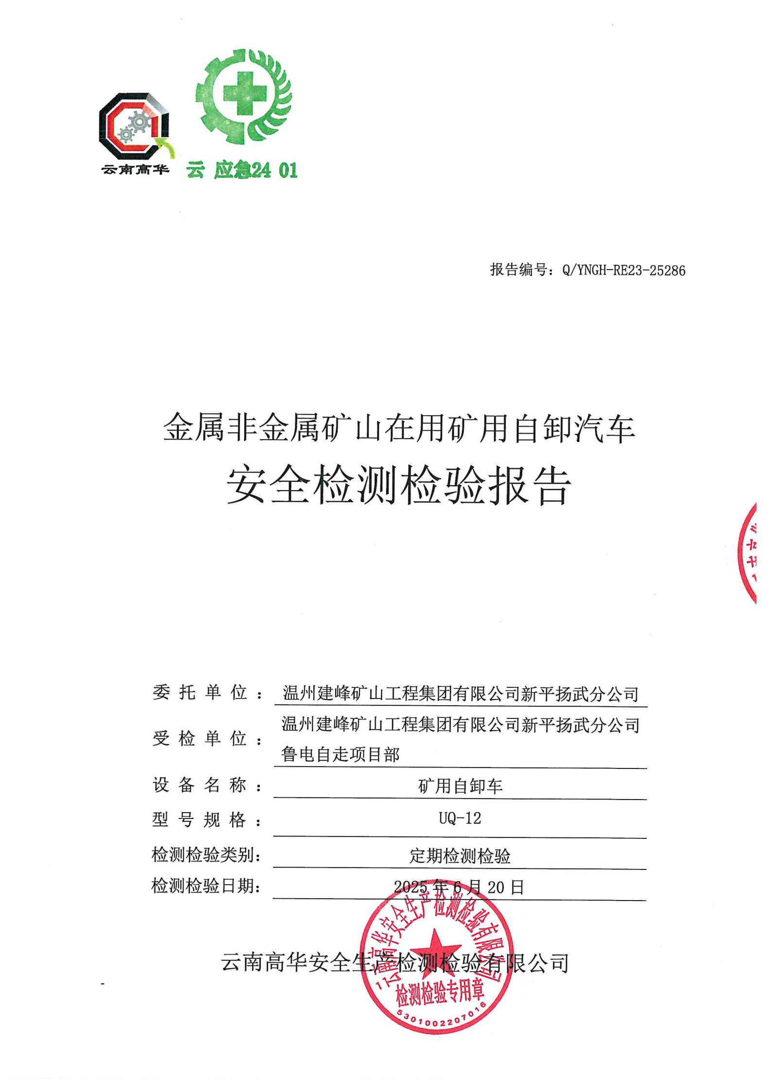 金属非金属矿山在用矿用自卸汽车安全检测检验报告