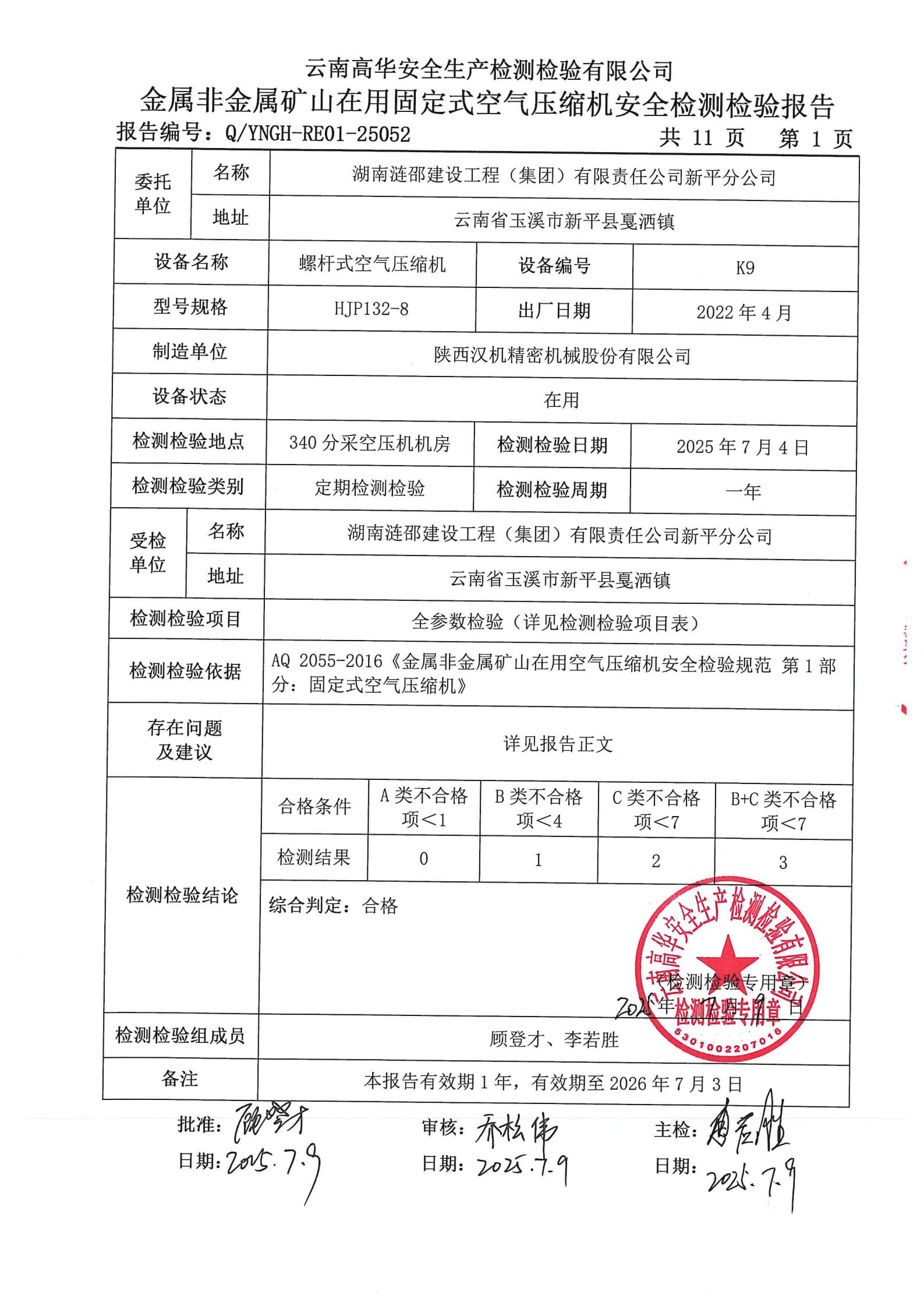 金属非金属矿山在用固定式空气压缩机安全检测检验报告