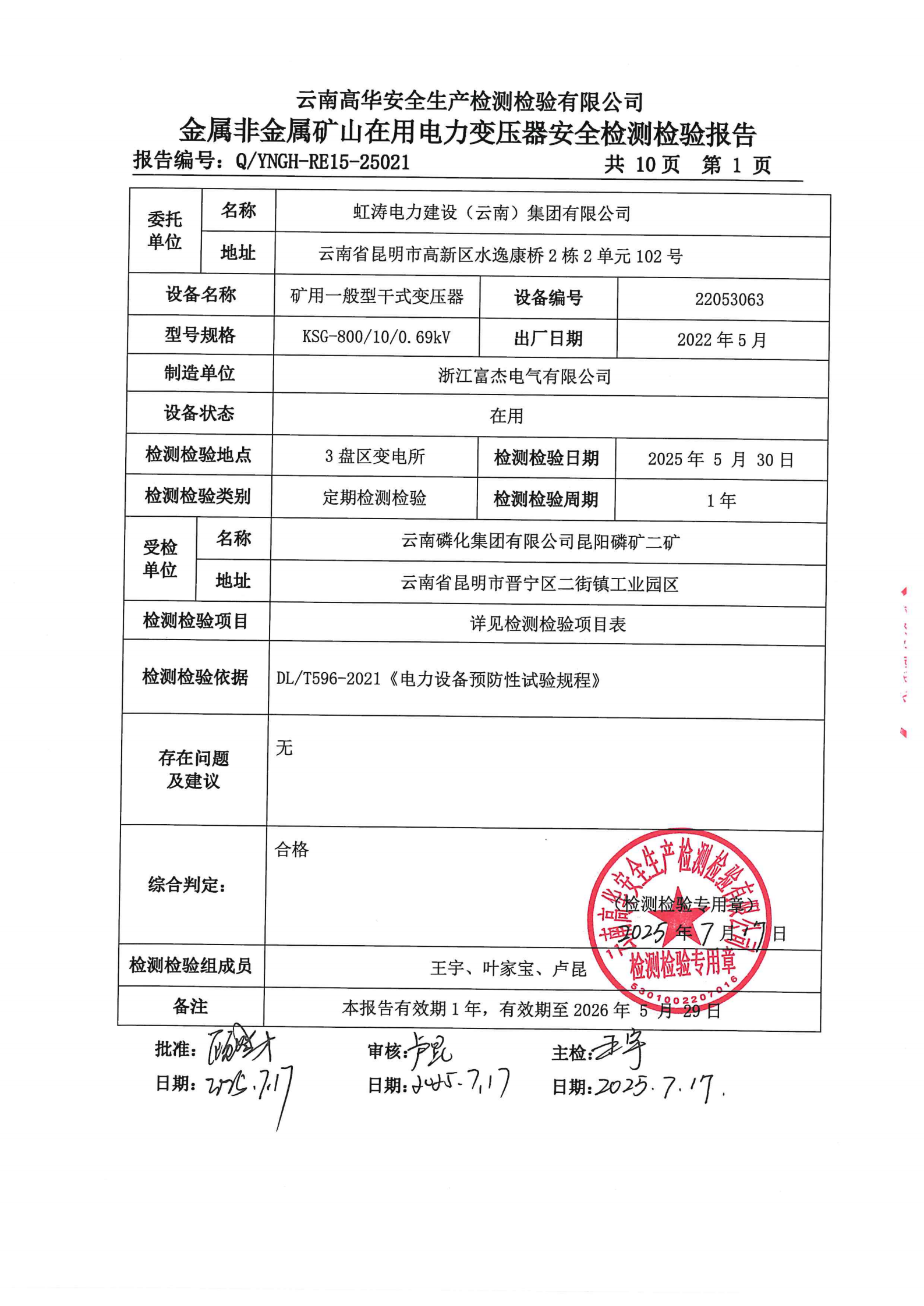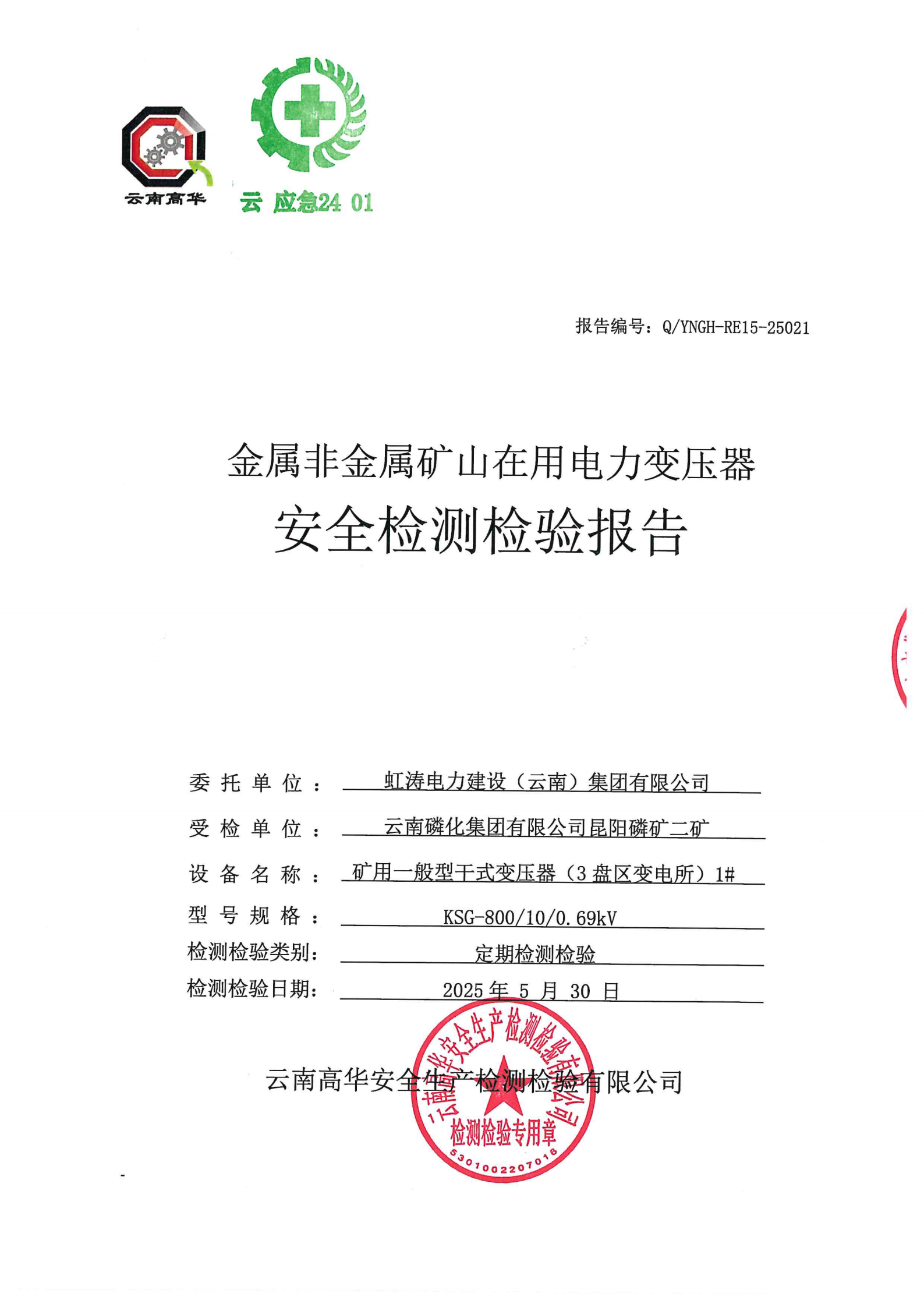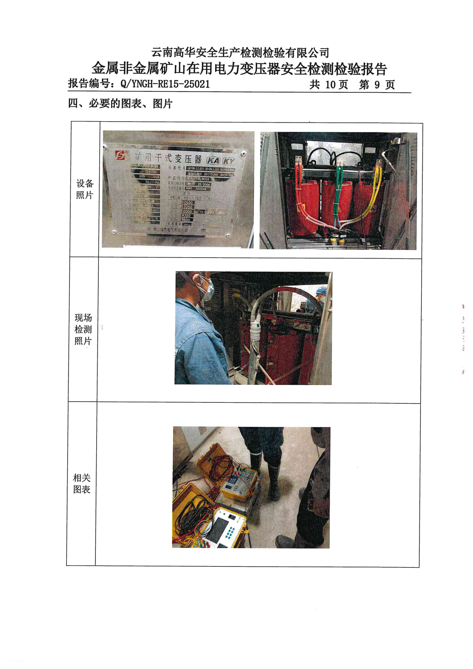 金属非金属矿山在用电力变压器安全检测检验报告