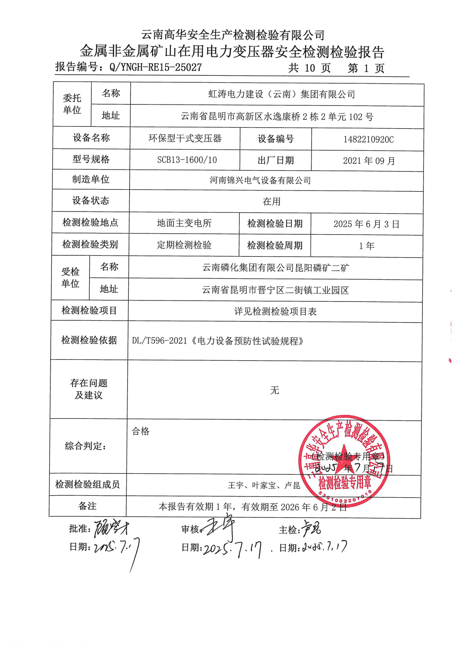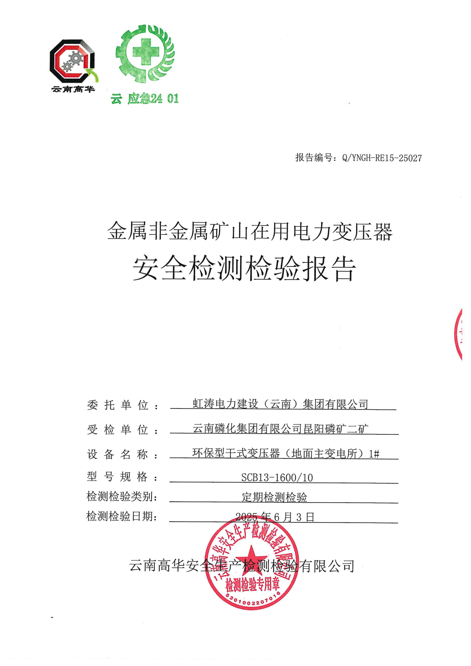 金属非金属矿山在用电力变压器安全检测检验报告