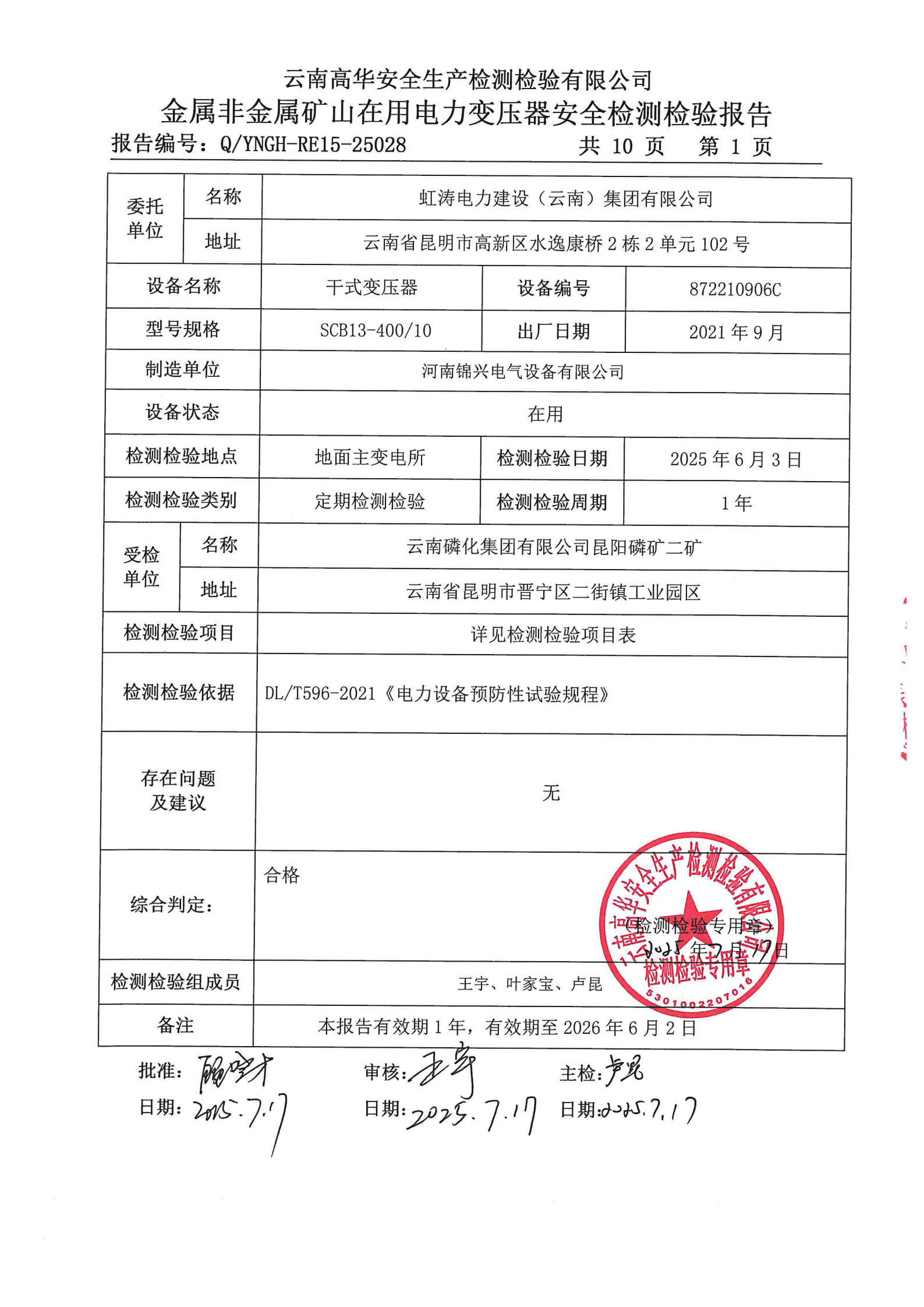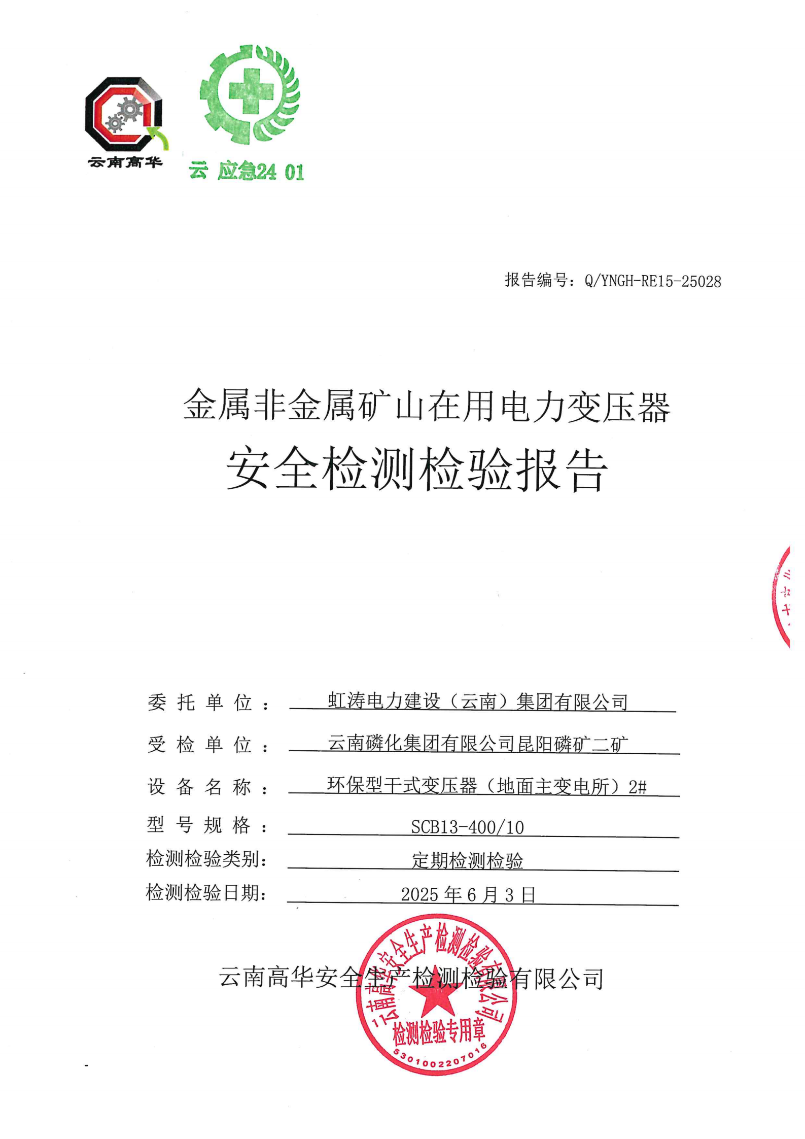 金属非金属矿山在用电力变压器安全检测检验报告