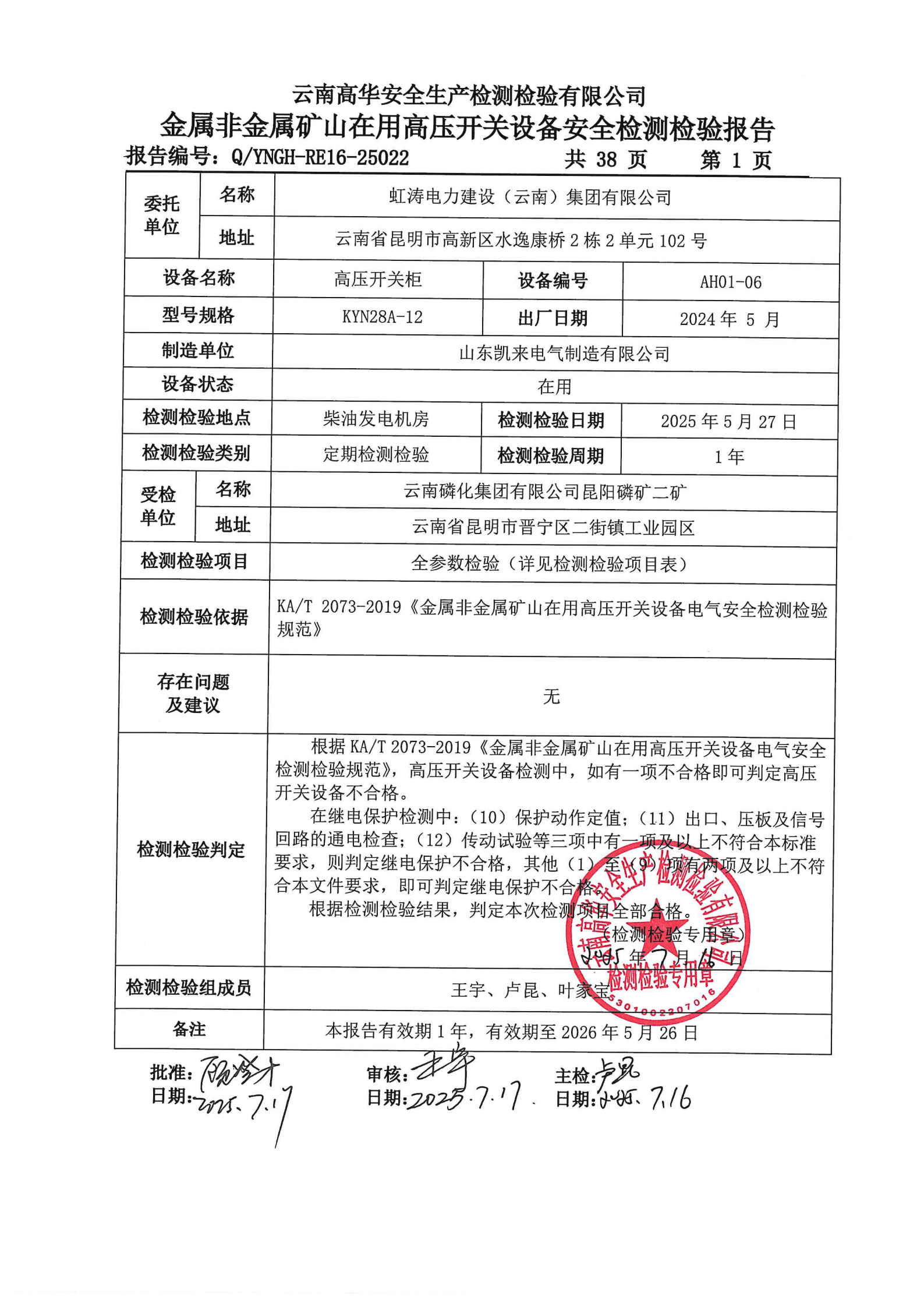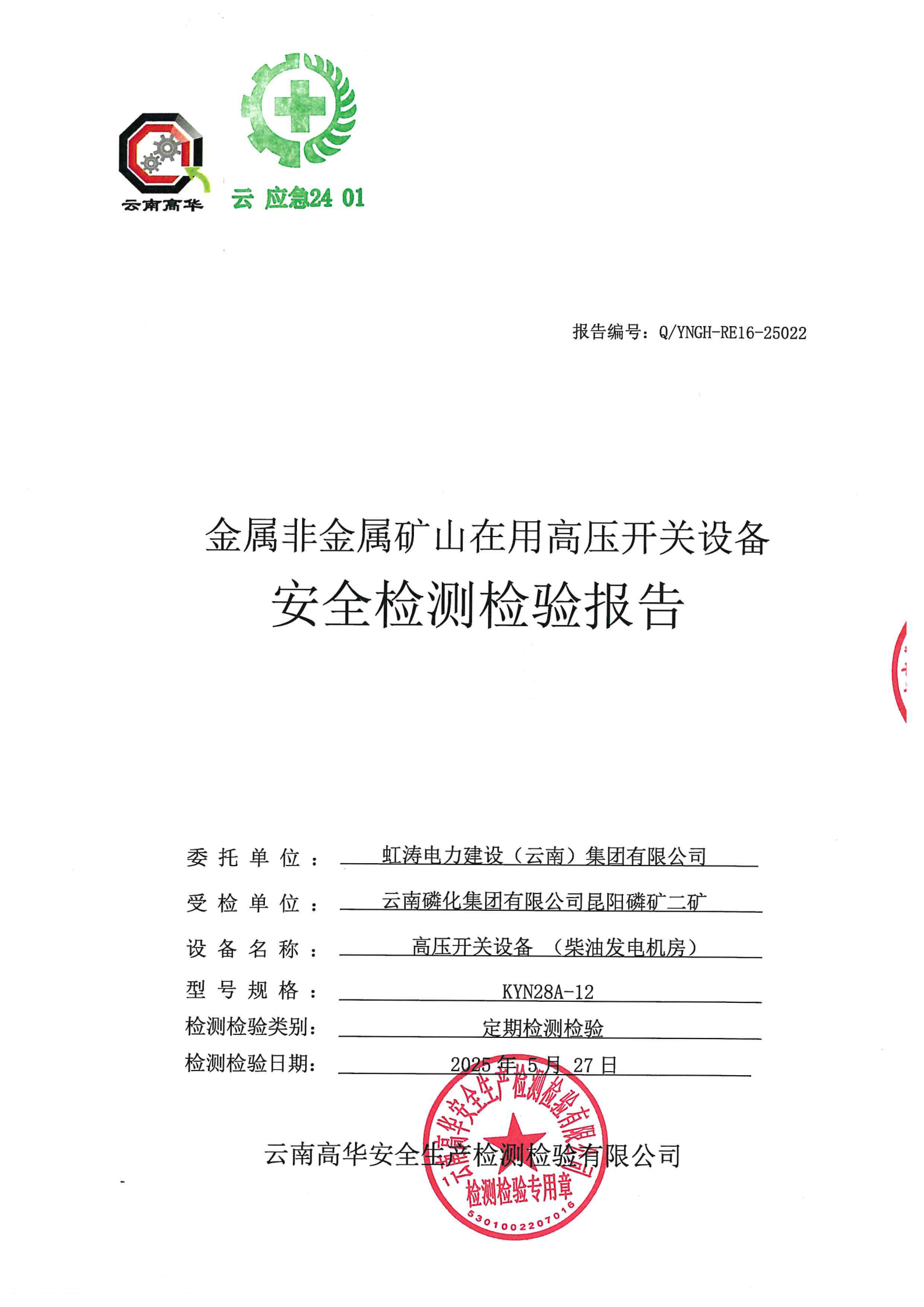 金属非金属矿山在用高压开关设备安全检测检验报告