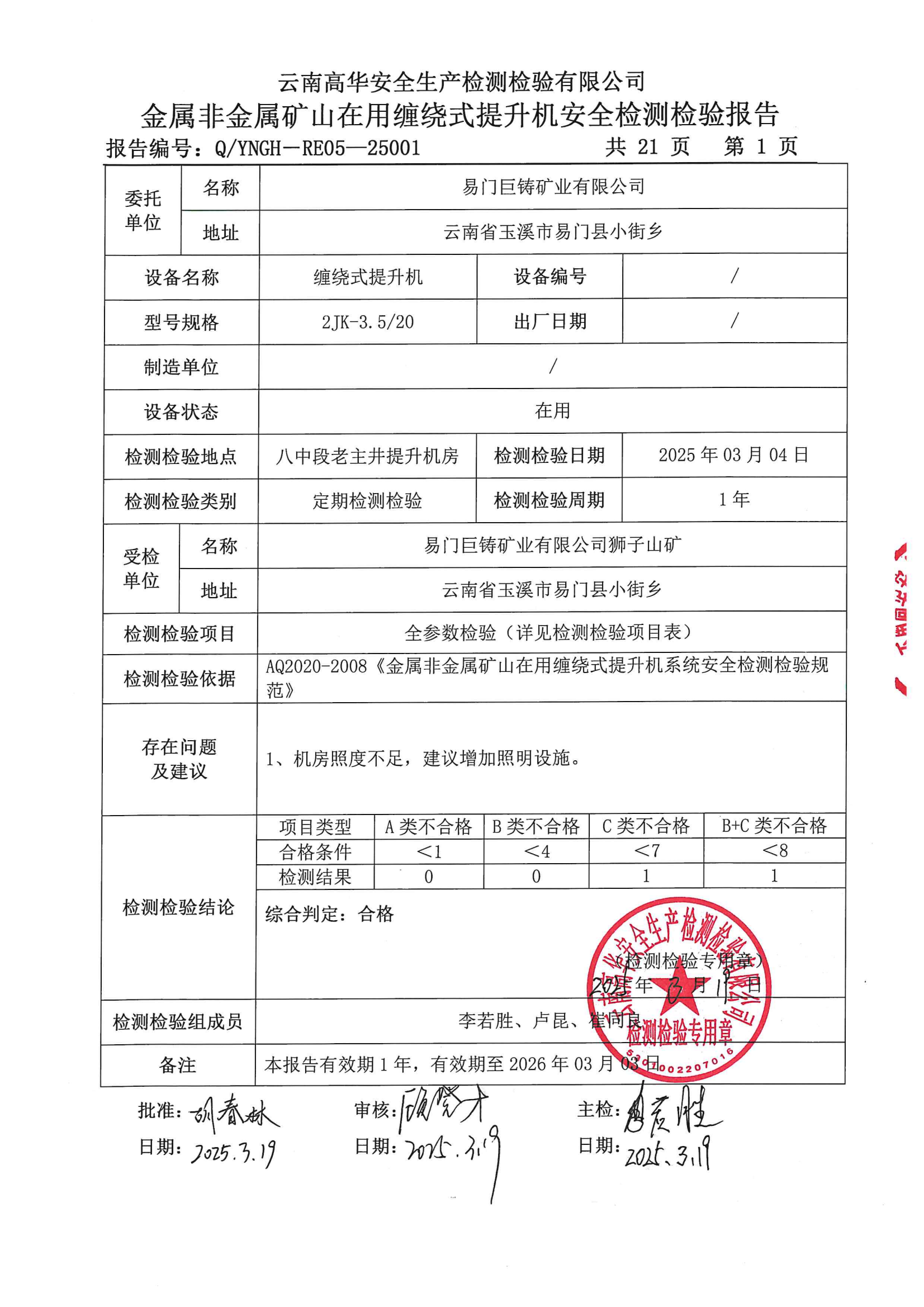 金属非金属矿山在用缠绕式提升机安全检测检验报告