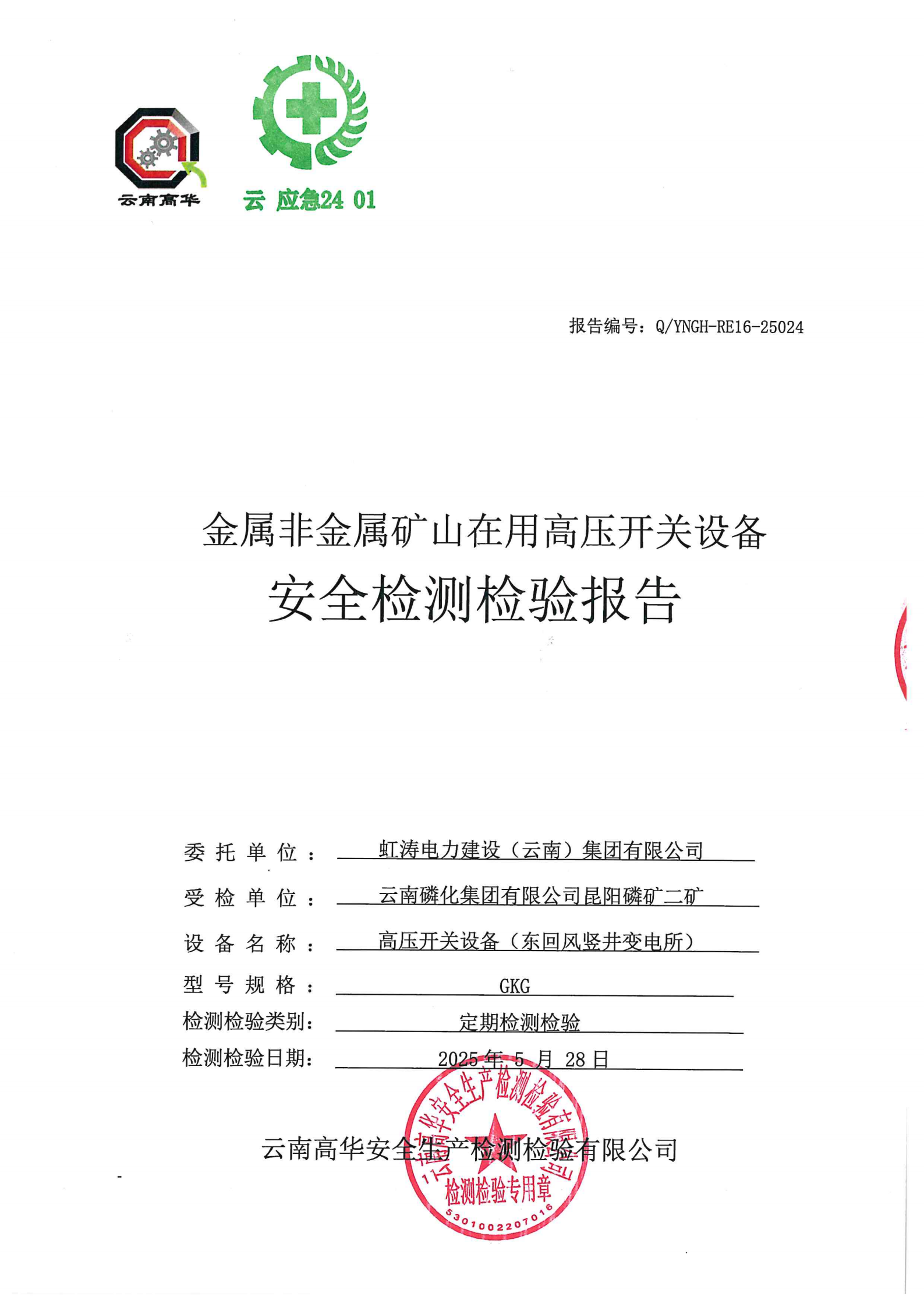金属非金属矿山在用高压开关设备安全检测检验报告