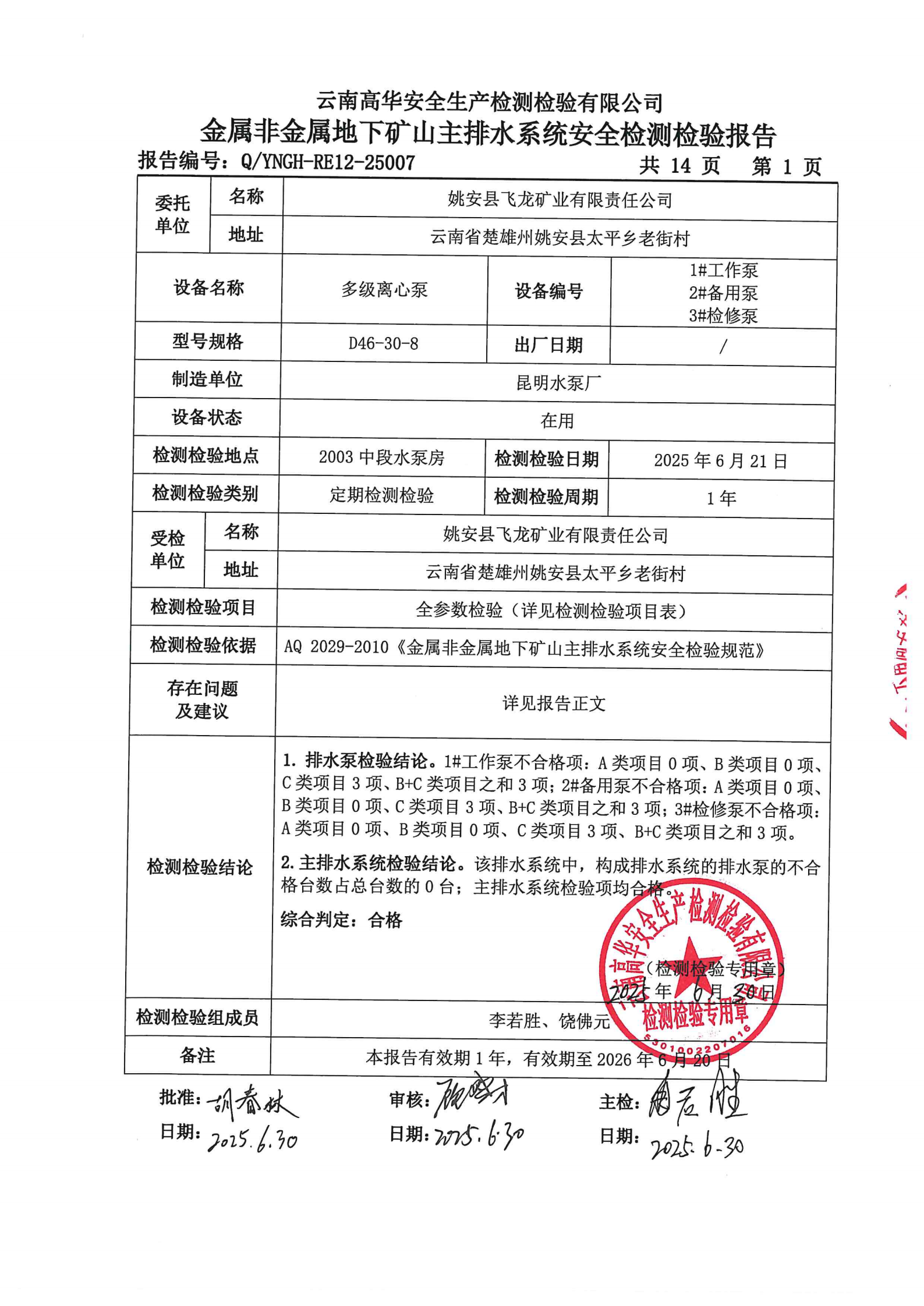 金属非金属地下矿山主排水系统安全检测检验报告
