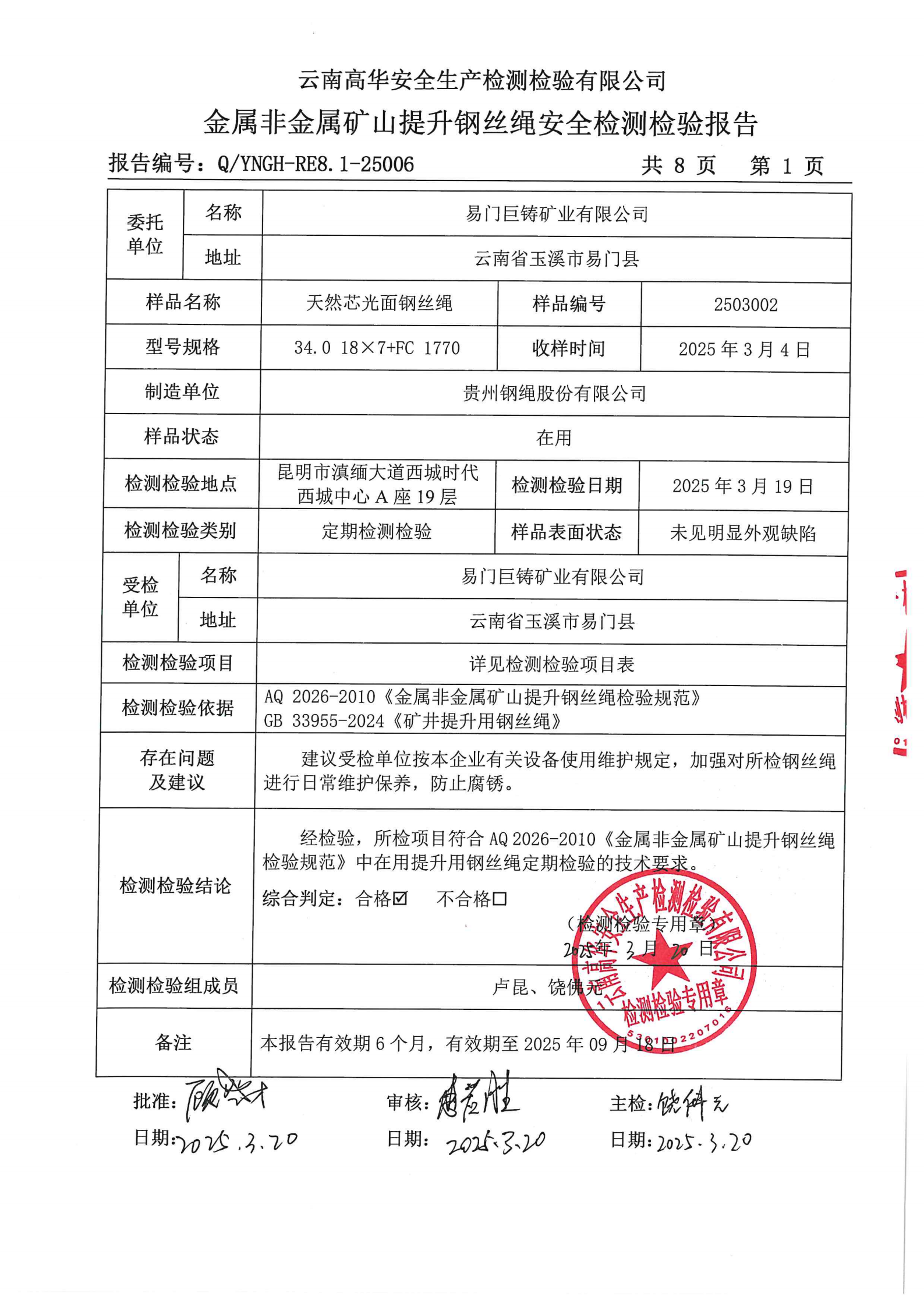 金属非金属矿山提升钢丝绳安全检测检验报告