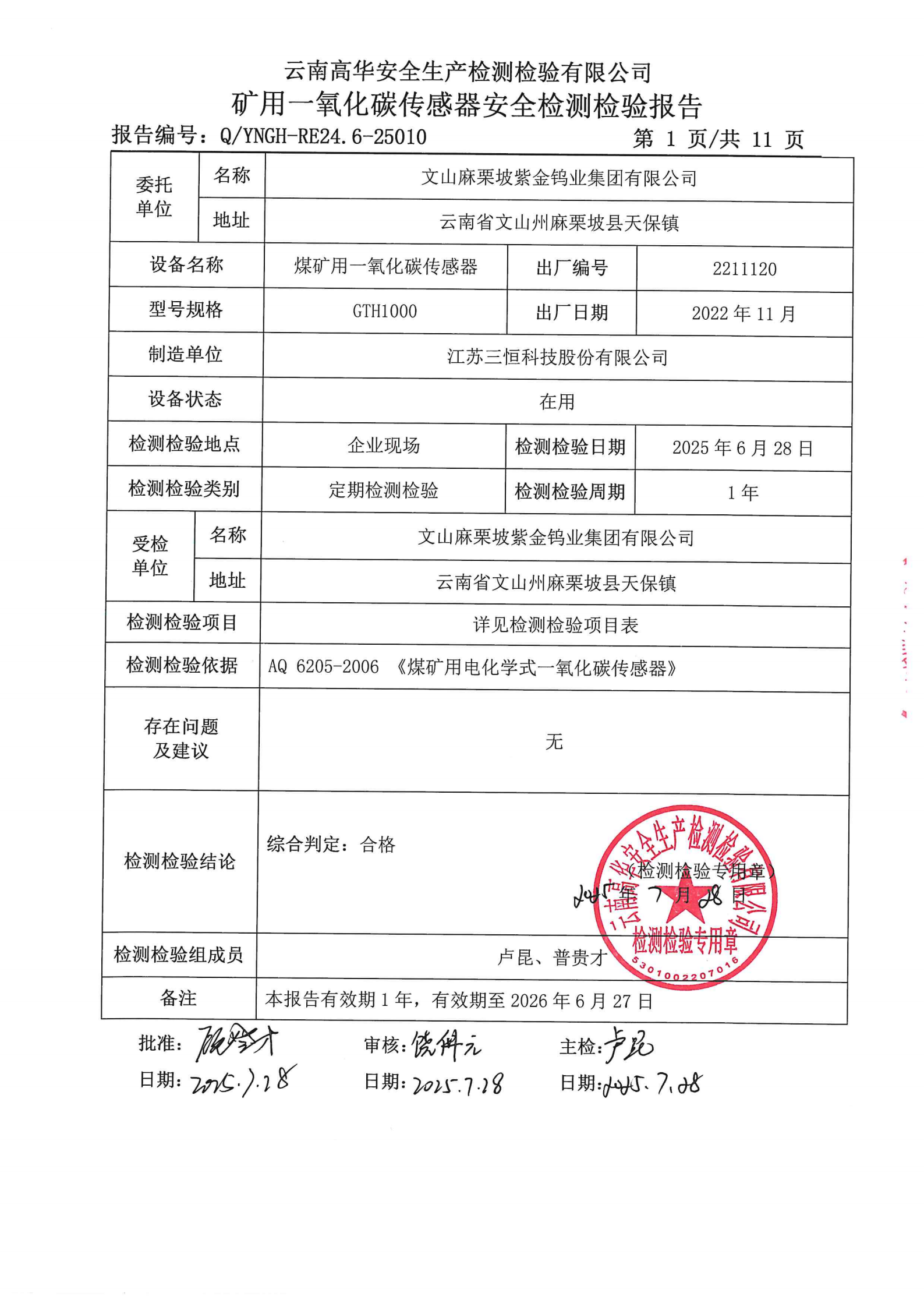 矿用一氧化碳传感器安全检测检验报告