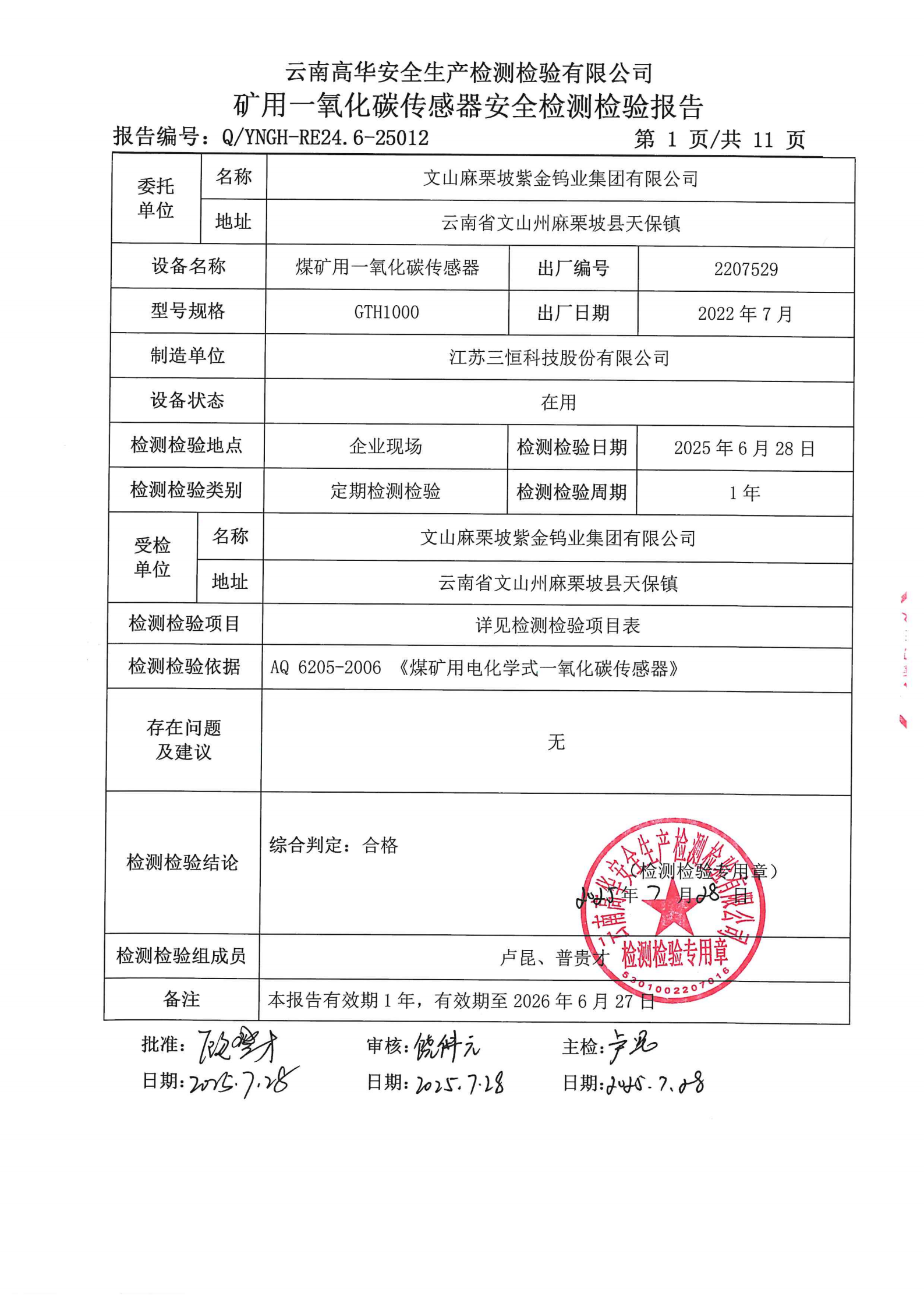 矿用一氧化碳传感器安全检测检验报告