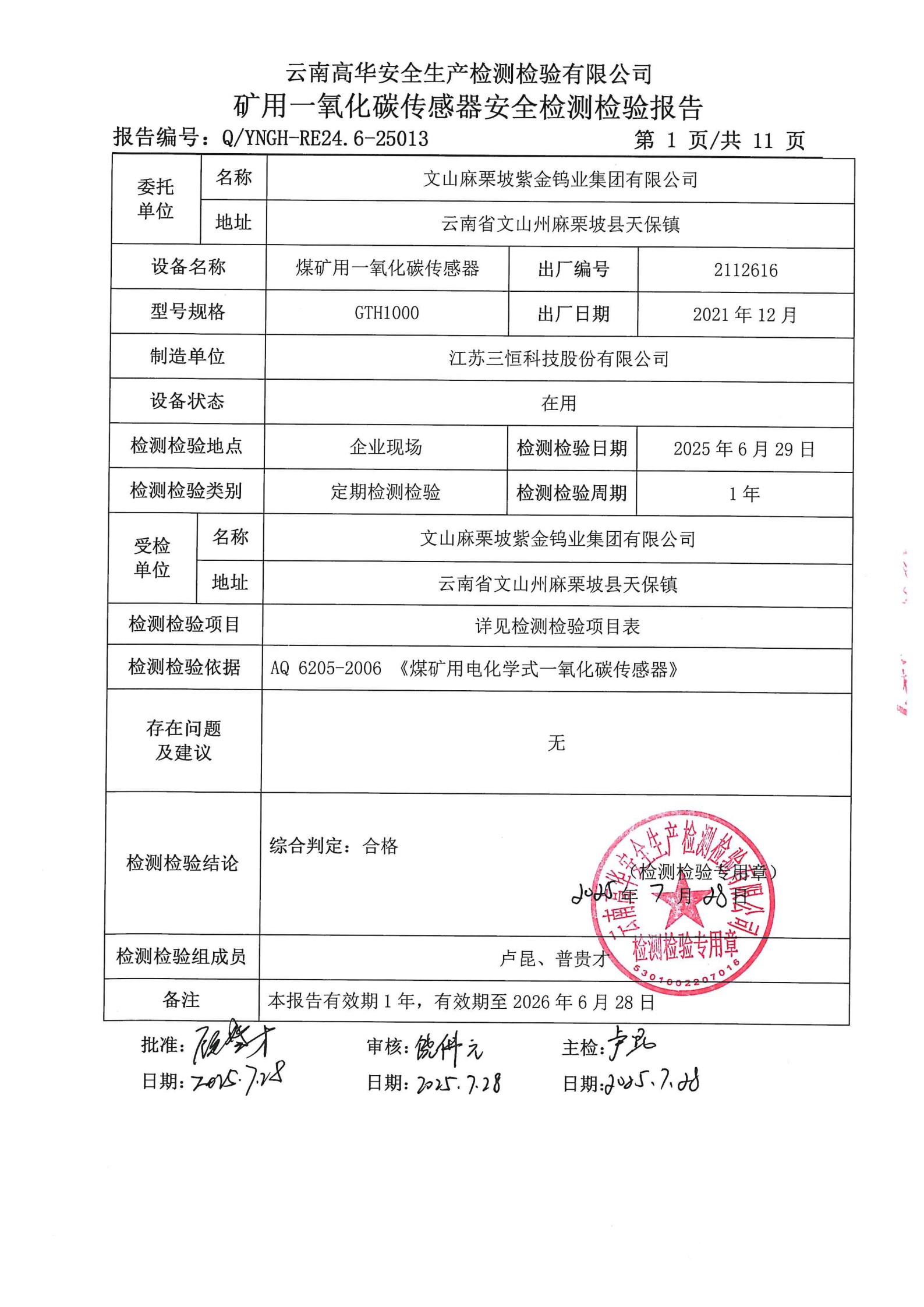 矿用一氧化碳传感器安全检测检验报告