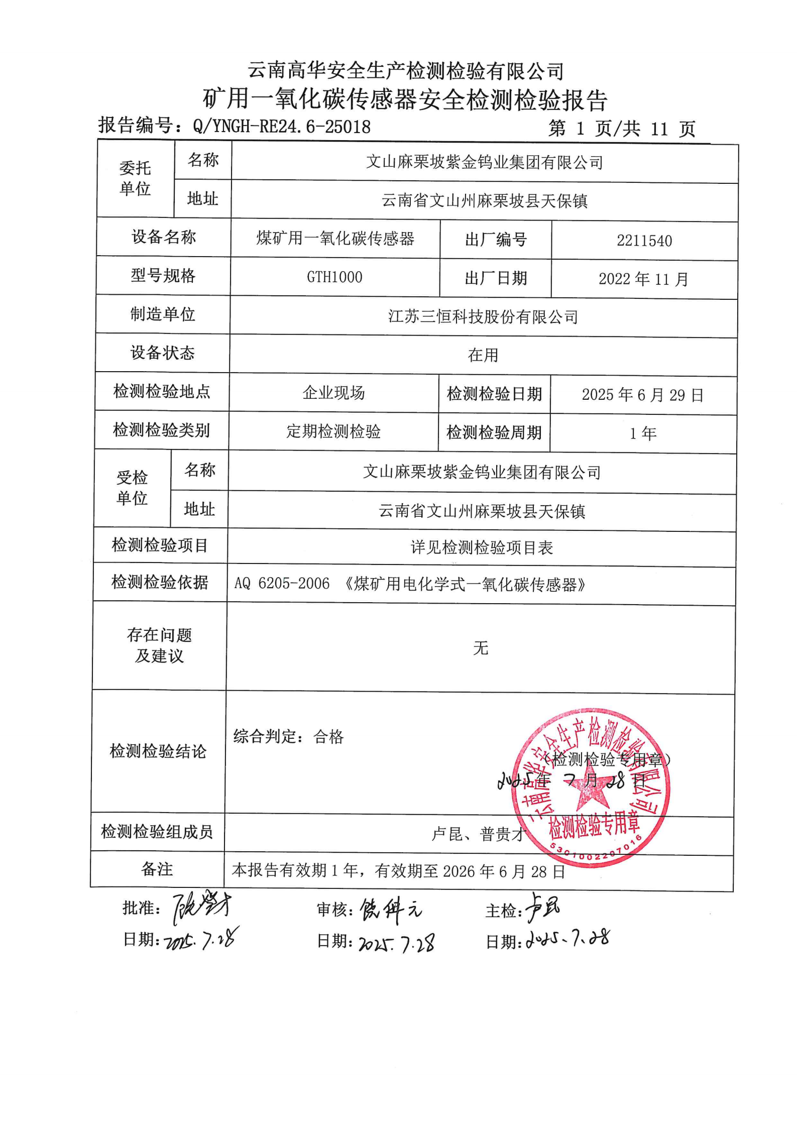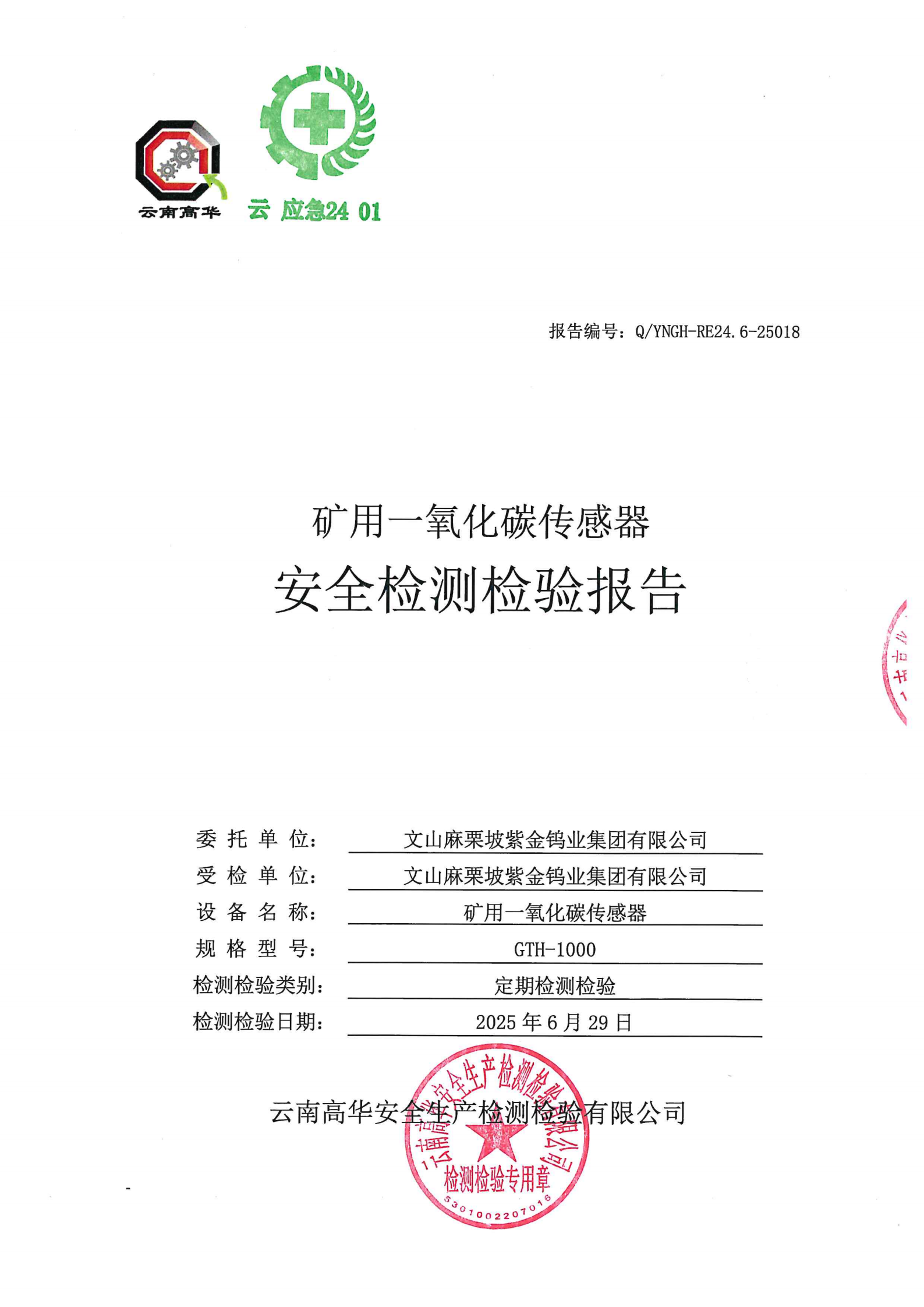 矿用一氧化碳传感器安全检测检验报告