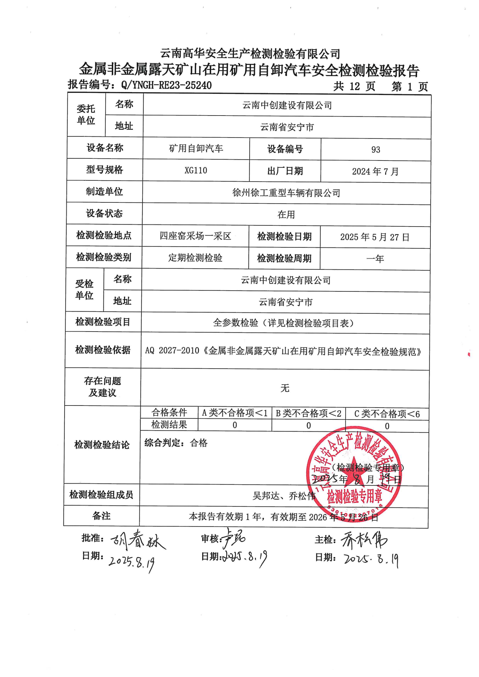 金属非金属露天矿山在用矿用自卸汽车安全检测检验报告