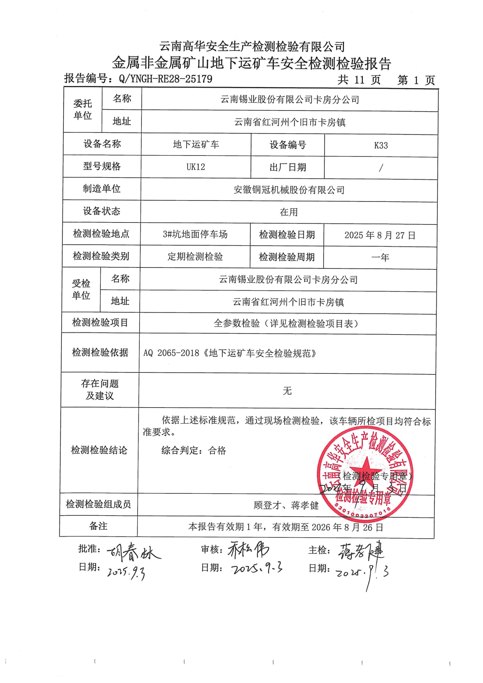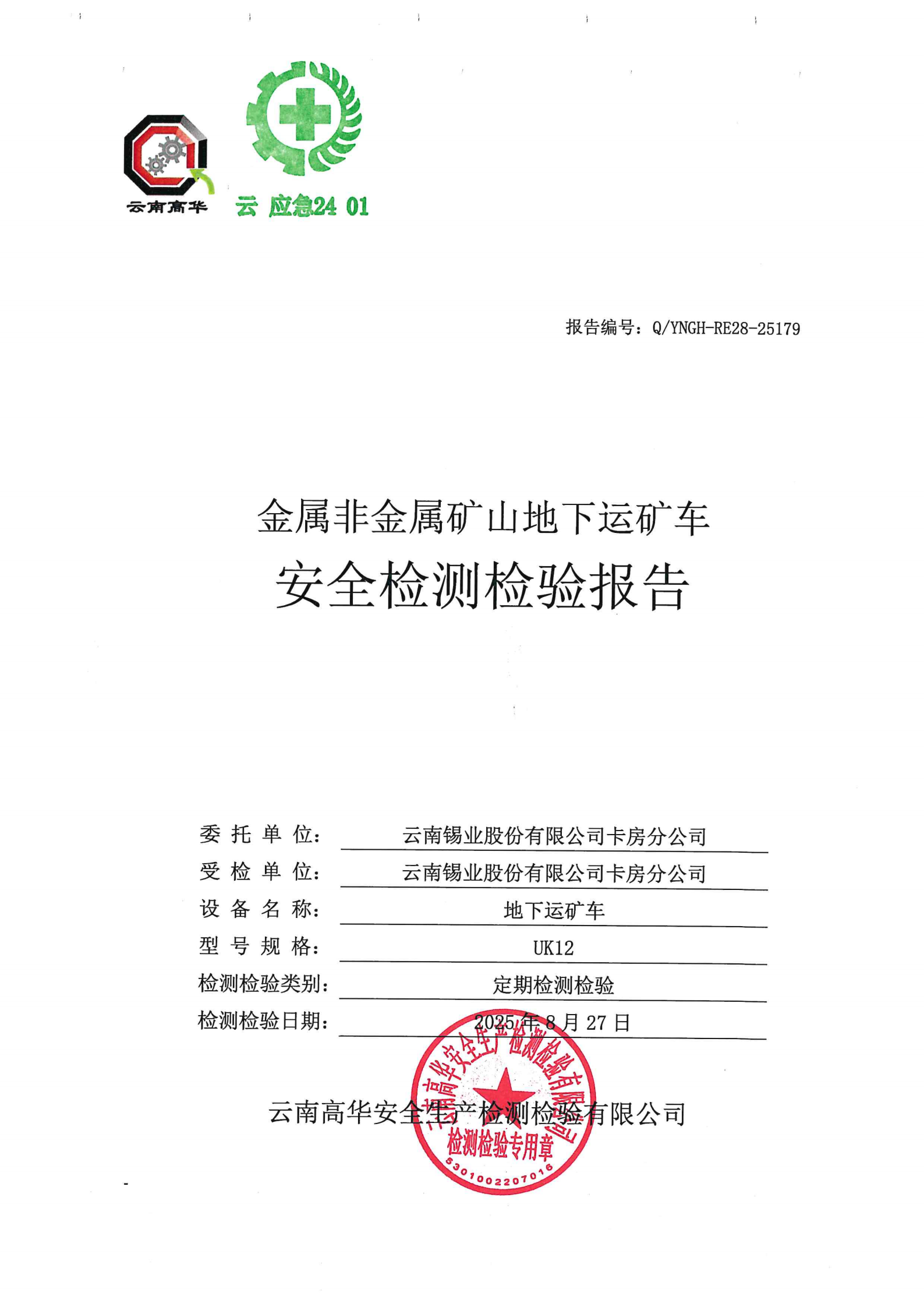 金属非金属矿山地下运矿车安全检测检验报告